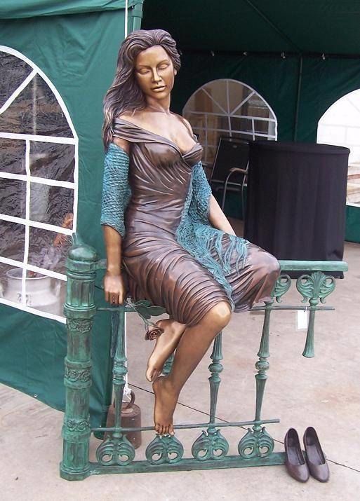 Schönes Bild einer Frau auf einem Zaun aus hochwertiger Bronze mit einem Kupfergehalt von mindestens 75%, was eine sehr lange Lebensdauer garantiert.