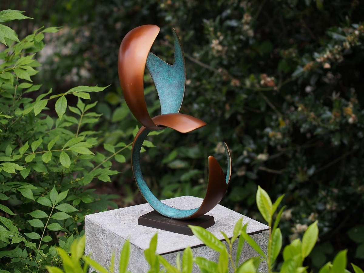 Diese moderne Bronzestatue einer abstrakten Skulptur hat die Größe 23x20x43cm und wird auf traditionelle Weise im sogenannten Wachsausschmelzverfahren hergestellt.