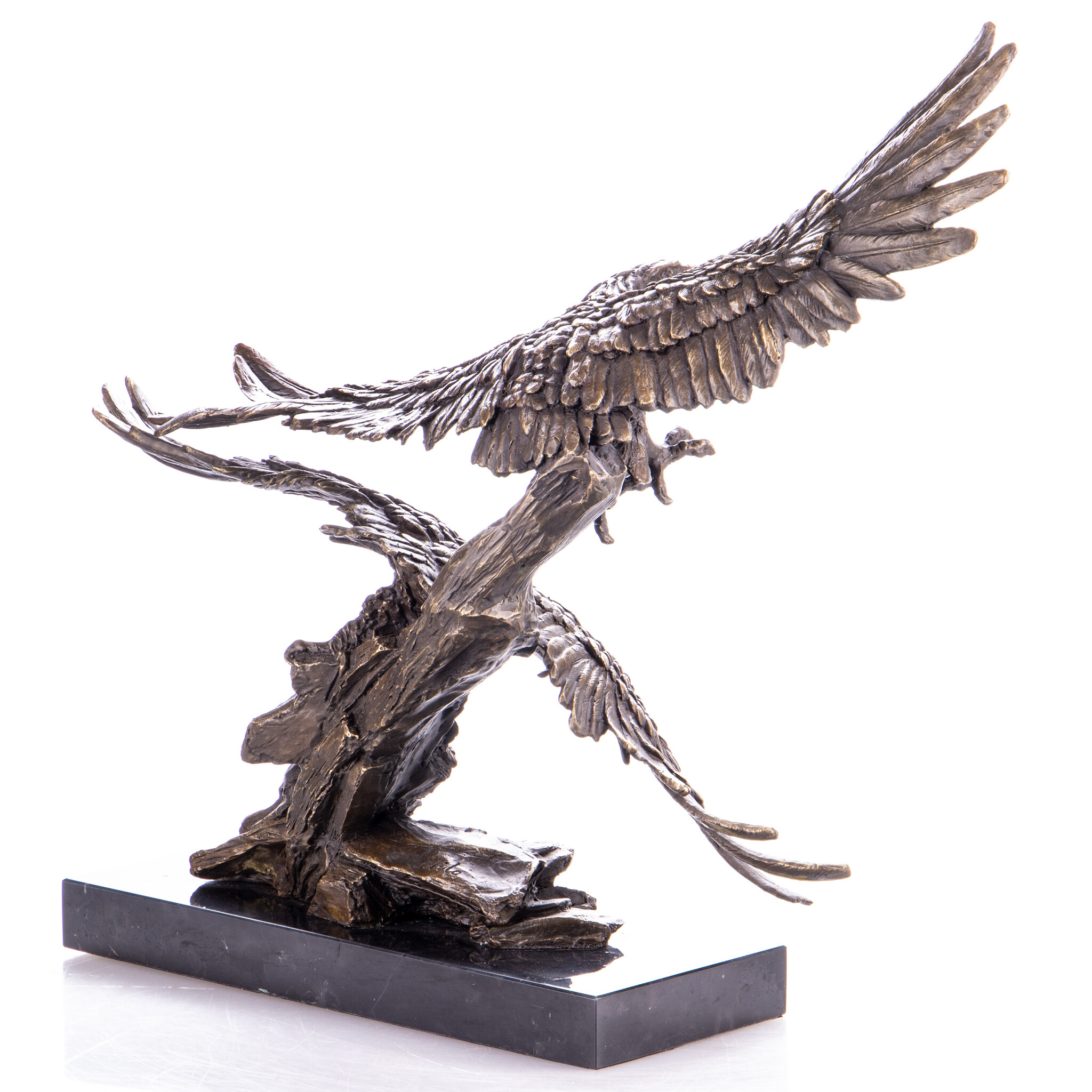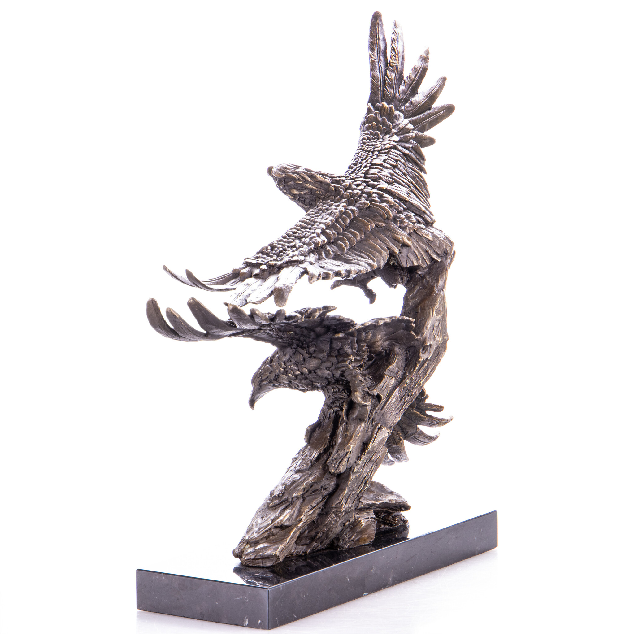Diese moderne Bronzestatue von zwei fliegenden Adlern auf einem Marmorsockel misst 42 x 46 x 20 cm und wird traditionell im sogenannten Wachsausschmelzverfahren hergestellt.