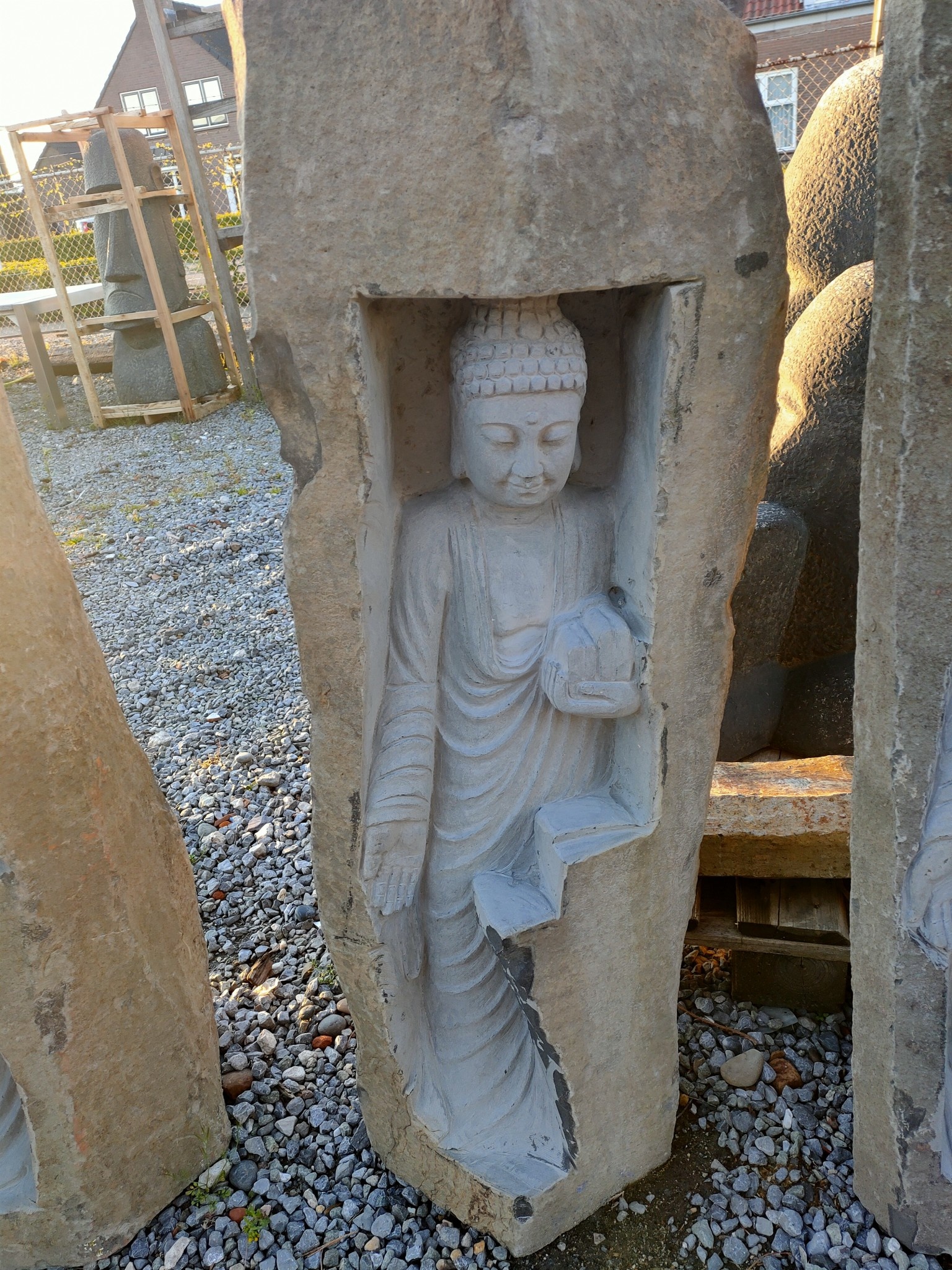 Diese Statue eines stehenden Buddhas, mit der komplett von Hand aus einer Basaltsäule gefertigt wird.