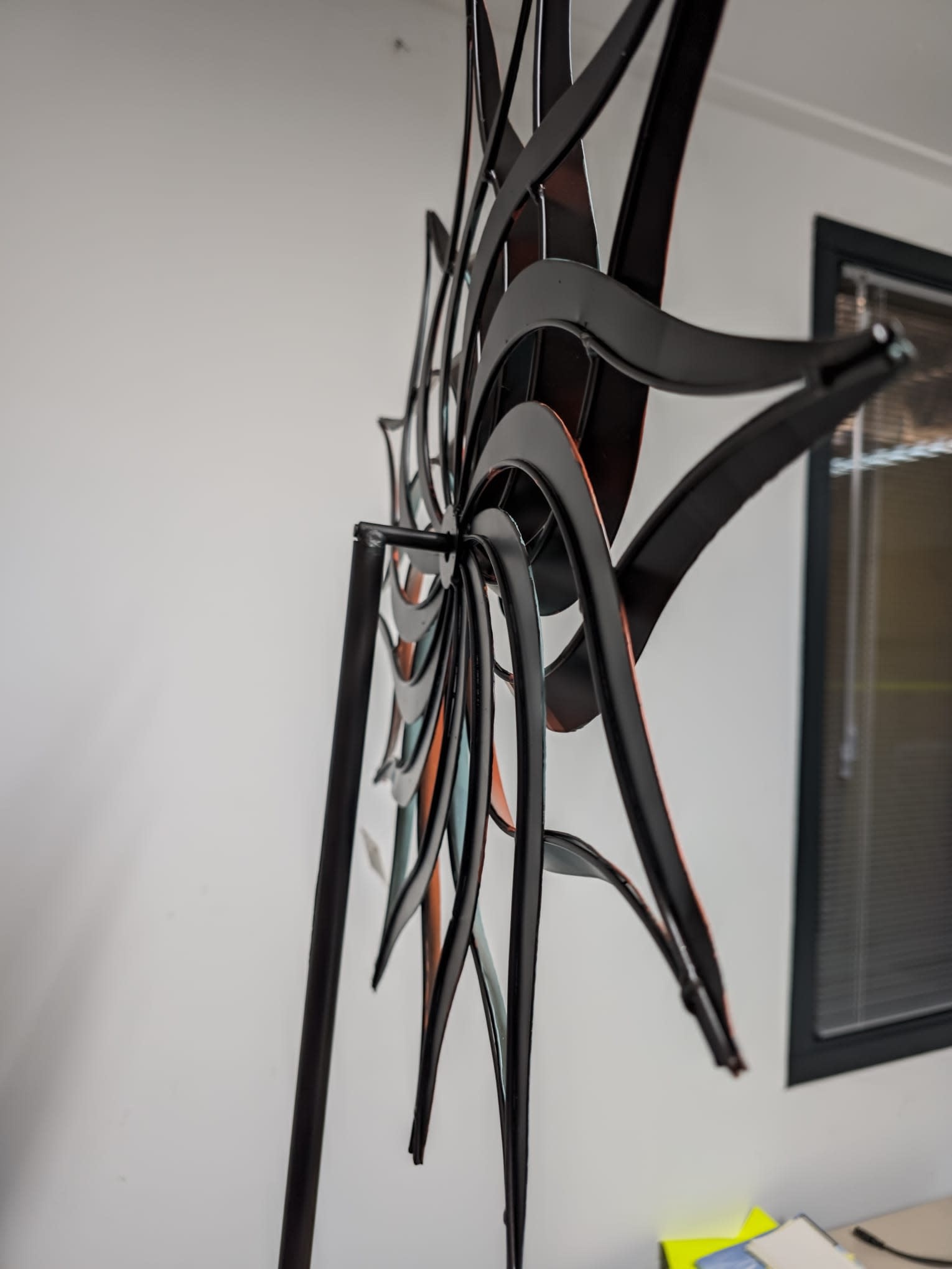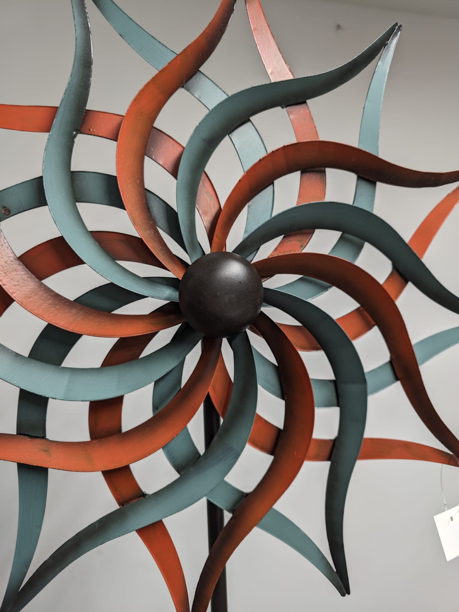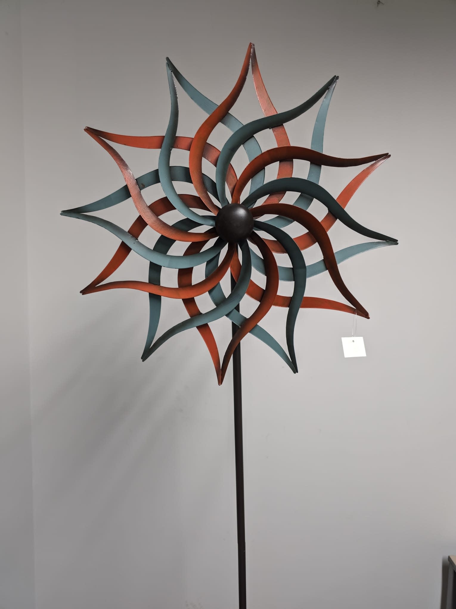 Dieses 184 cm hohe Modell fängt schon beim geringsten Wind an, sich zu drehen, da die rotierenden Teile mit Kugellagern ausgestattet sind.