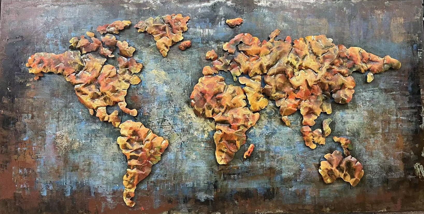 Ein wunderschönes 3D-Metallgemälde mit der Darstellung einer Weltkarte, meisterhaft aus einzelnen Metallteilen gefertigt, die alle von Hand zusammengeschweißt sind, um einen optimalen 3D-Effekt zu erzielen. Eine schöne Wanddekoration für Ihr Zuhause, draußen unter einem Dach oder in Ihrem Unternehmen. Farben und allgemeines Erscheinungsbild können vom Foto abweichen, da das gesamte Objekt von Menschenhand gefertigt wurde.