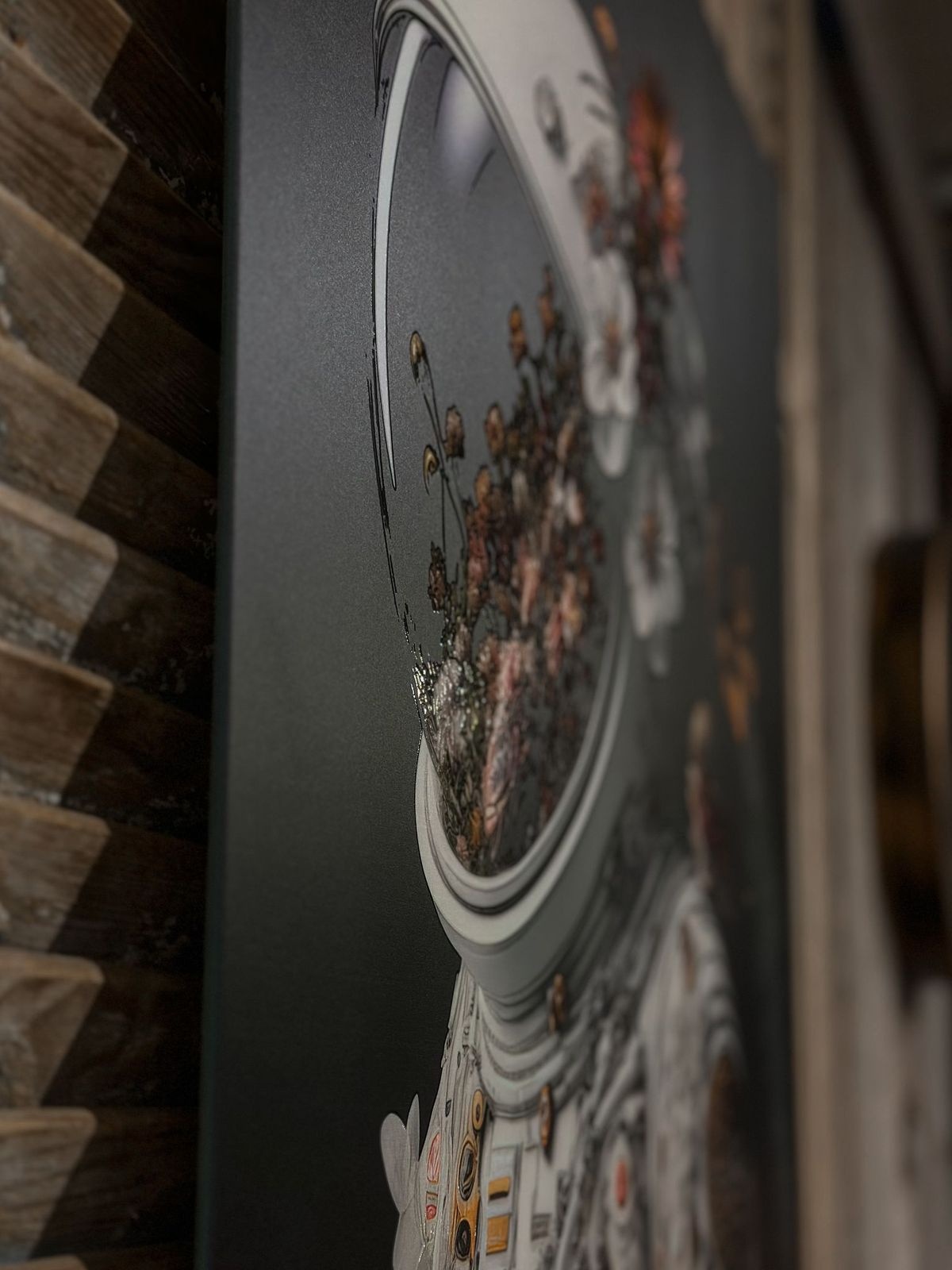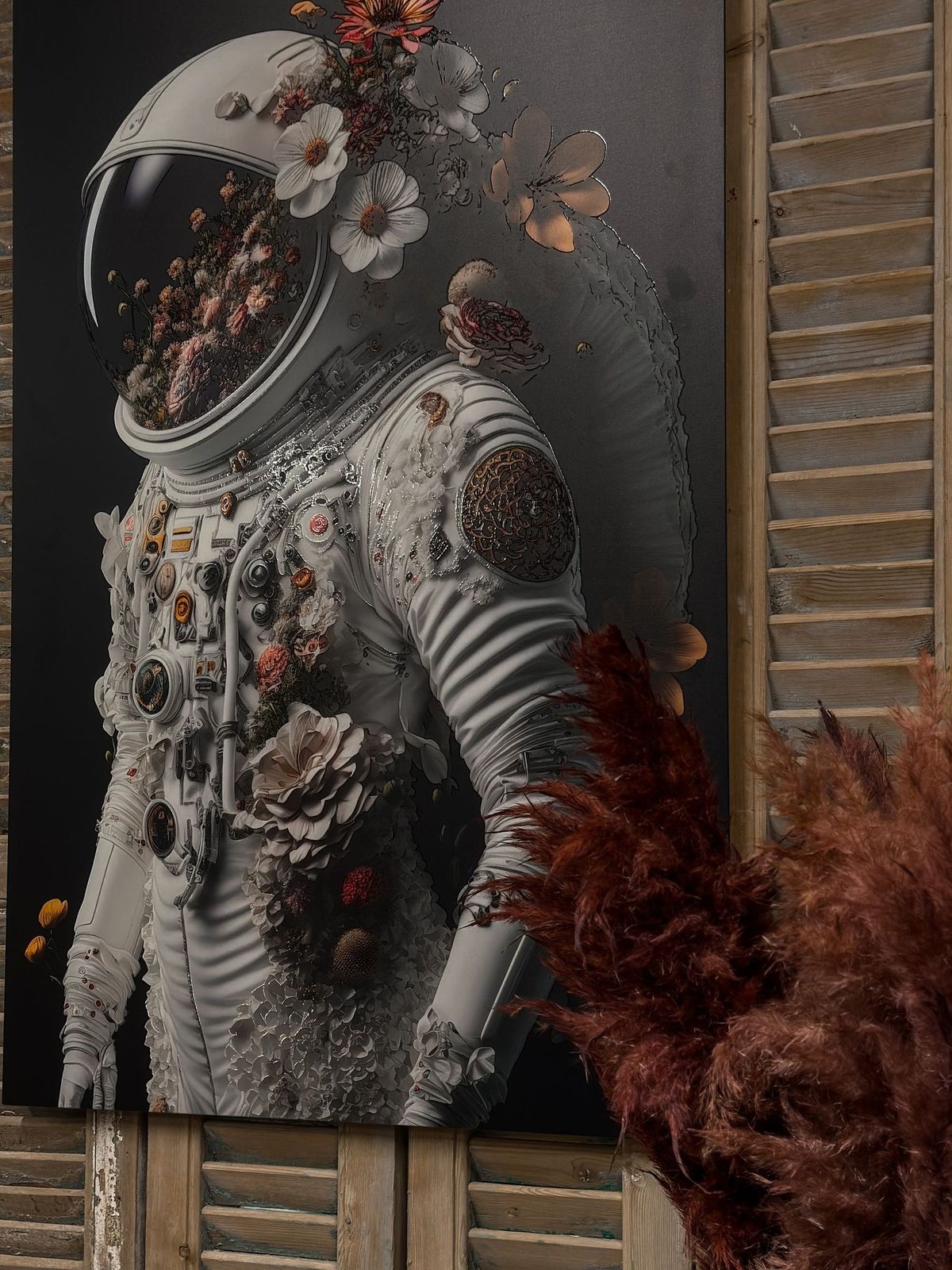 Glasgemälde Astronaut mit Blumen mit 3D-Effekt 70x110cm.