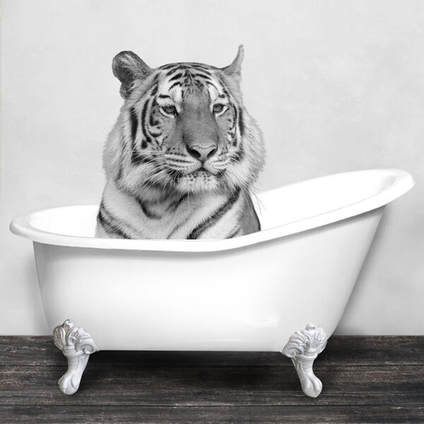 Dieses Glasgemälde aus gehärtetem Glas mit der Größe 80×80 cm ist eine sehr schöne Wanddekoration für jedes moderne Interieur zu Hause oder im Geschäft. Dieses Modell mit dem Bild eines Tigers in einer Badewanne ist scharf dargestellt.