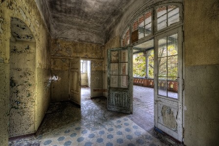 Glasmalerei Verfallenes Gebäude 110x160cm.