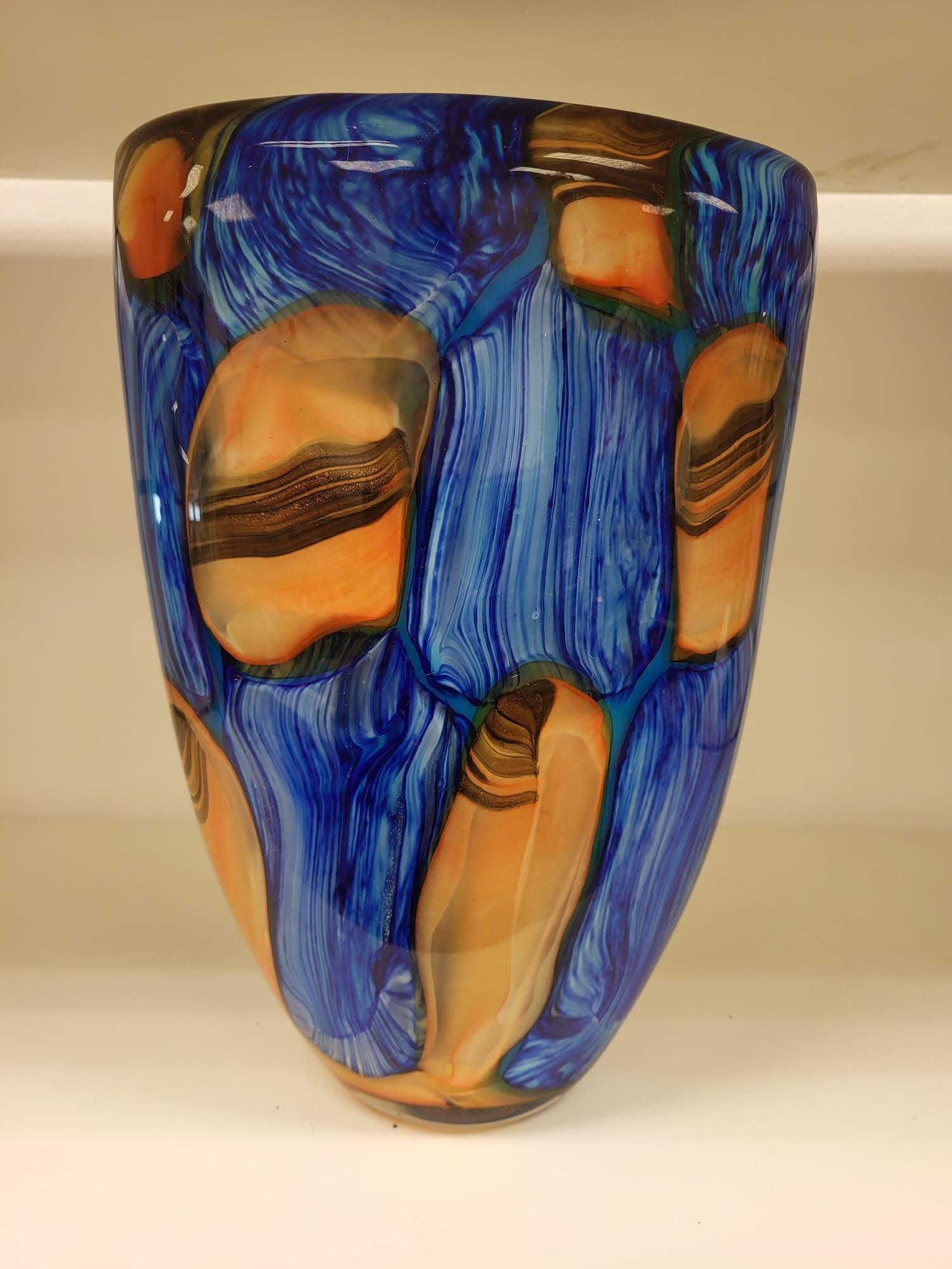 Dieses schöne, handgefertigte Glasobjekt in Form einer halbhohen Vase in den Farben Braun und Blau ist ein schönes Dekorationsstück für Ihr Zuhause oder Büro, aber auch schön zum Verschenken. Die Qualität dieser Vase ist gut. Es wird von handwerklichen Glasbläsern hergestellt. Es ist immer wieder ein Wunder, wie diese Handwerker einen Glashaufen in eine wunderschöne Skulptur verwandeln.