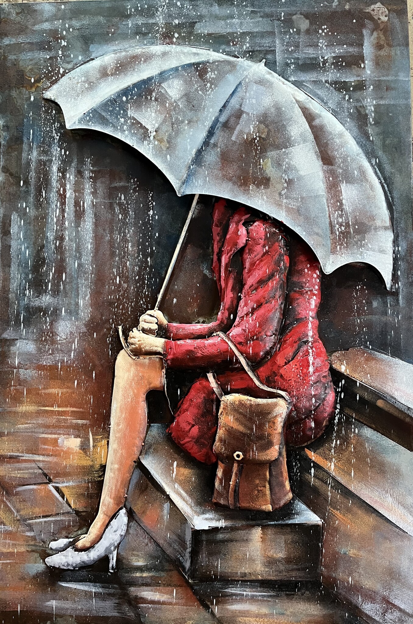 Metall-3D-Gemälde mit Frau im roten Mantel im Regen. Abmessungen 80x120cm hoch.