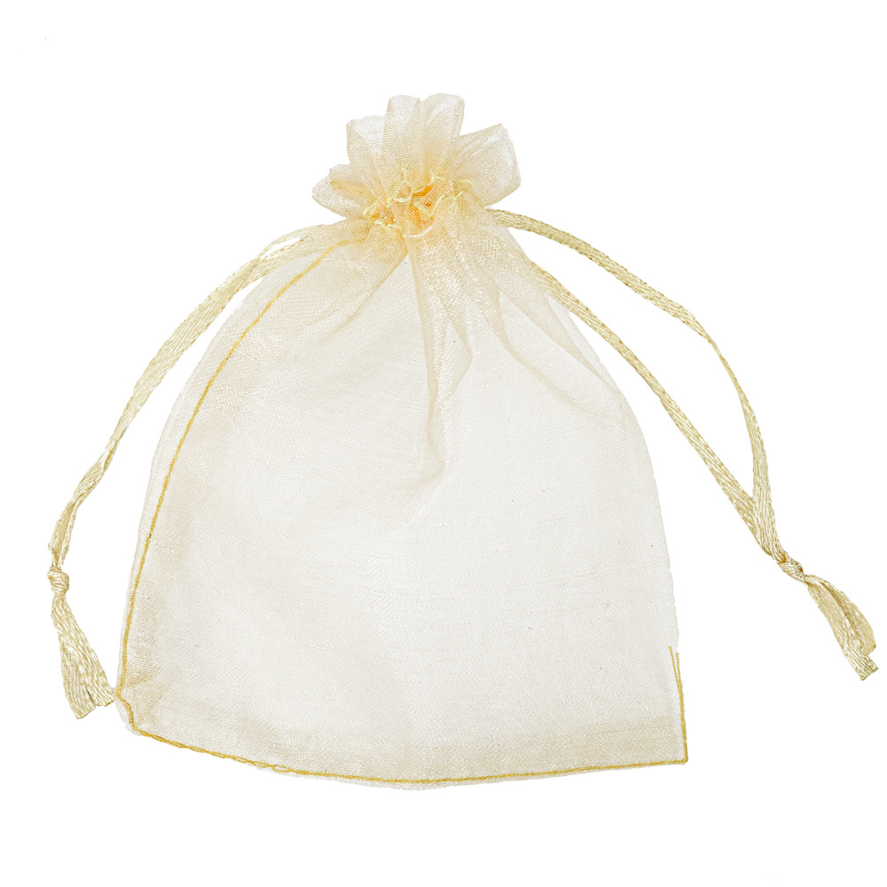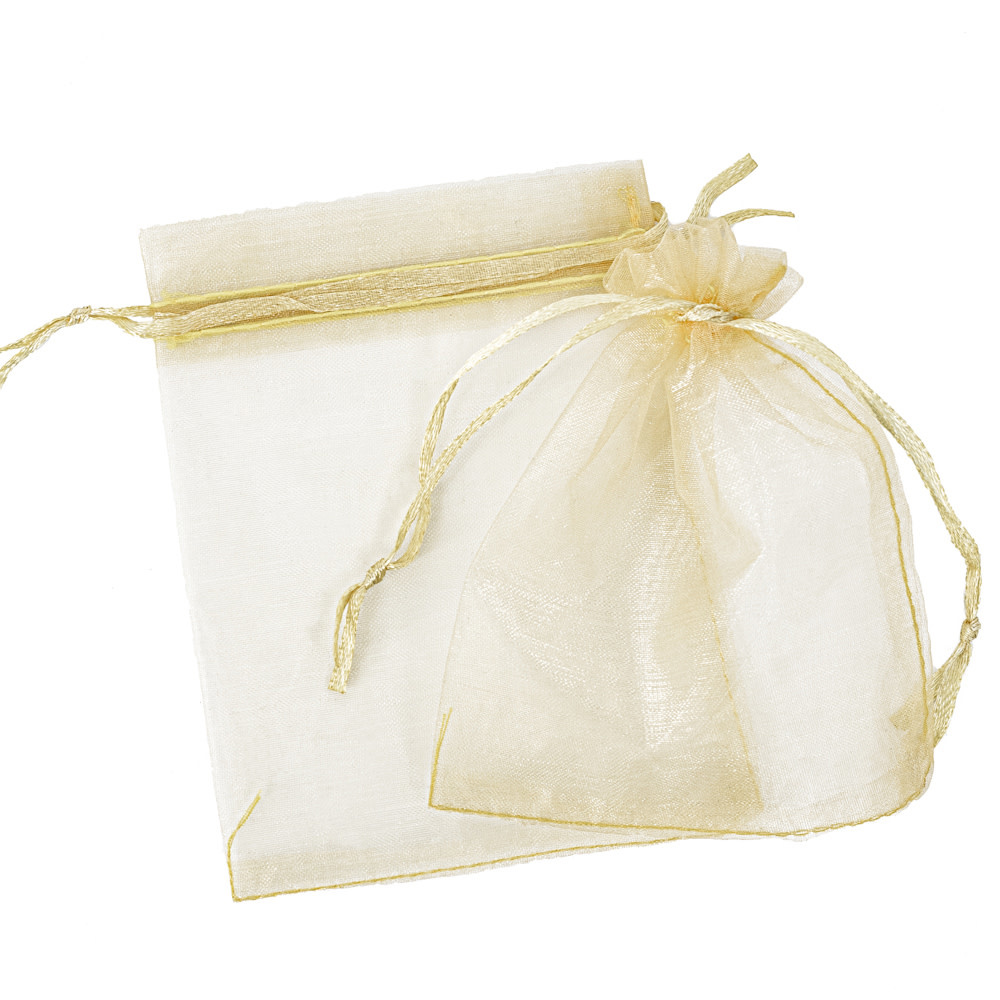 Gut verarbeitete Taschen aus durchscheinendem, goldfarbenem Organza-Gewebe mit Kordelzug.