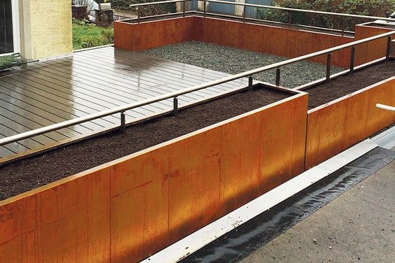 Die Oberkante ist doppelt umgebaut und 4 cm breit, was diesem Behälter ein schönes zeitloses und robustes Aussehen verleiht. Größere Behältergrößen sind innen mit Cortenstahlträgern versehen, damit die Oberflächen nicht konvex werden.