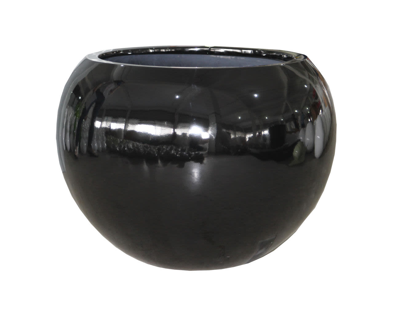 Schöner schwarzer runder konvexer Topf aus Polystone. Dieser große Kugeltopf wird ein wunderschönes Dekorationsstück in Ihrem Interieur oder in Ihrem Unternehmen sein. Dieser große Topf in Hochglanzschwarz lässt sich mit Ihren anderen Möbeln in fast jeder modernen Einrichtung kombinieren. Polystone ist ein Material aus Steingrieß/-pulver, gemischt mit einem Kunstharz. Diese Mischung, kombiniert mit Glasfasermatten, ist ein sehr starkes Material, das sich hervorragend für dieses Produkt eignet. Als Finish wurde ein Hochglanzlack verwendet, der mit Autolack vergleichbar ist.