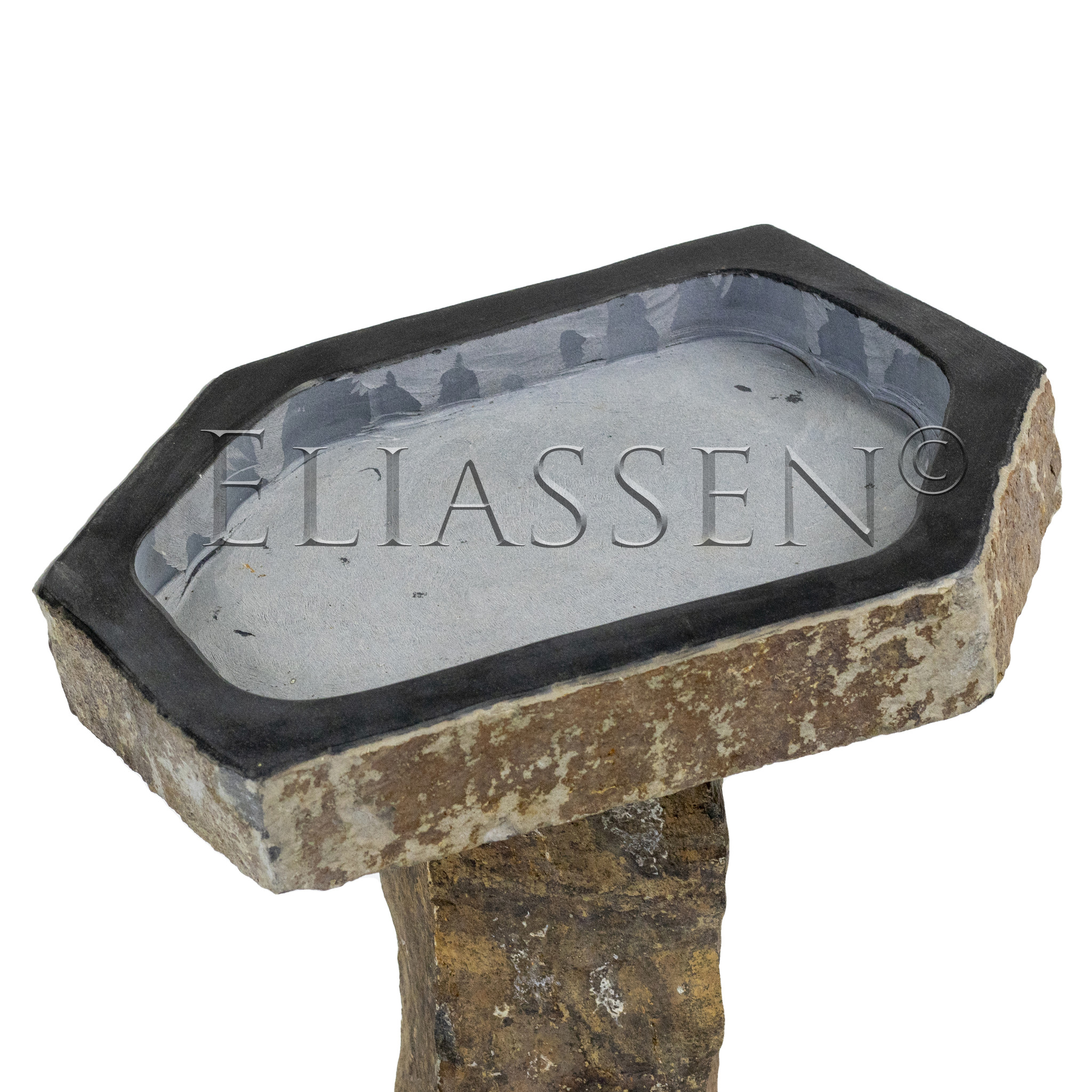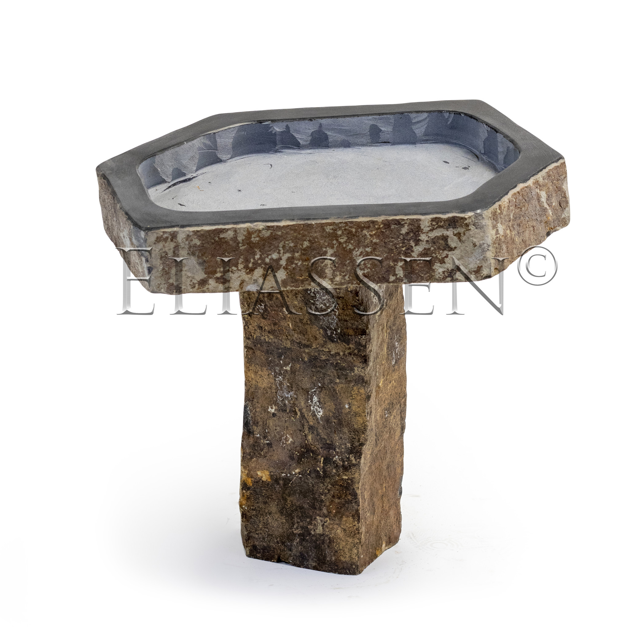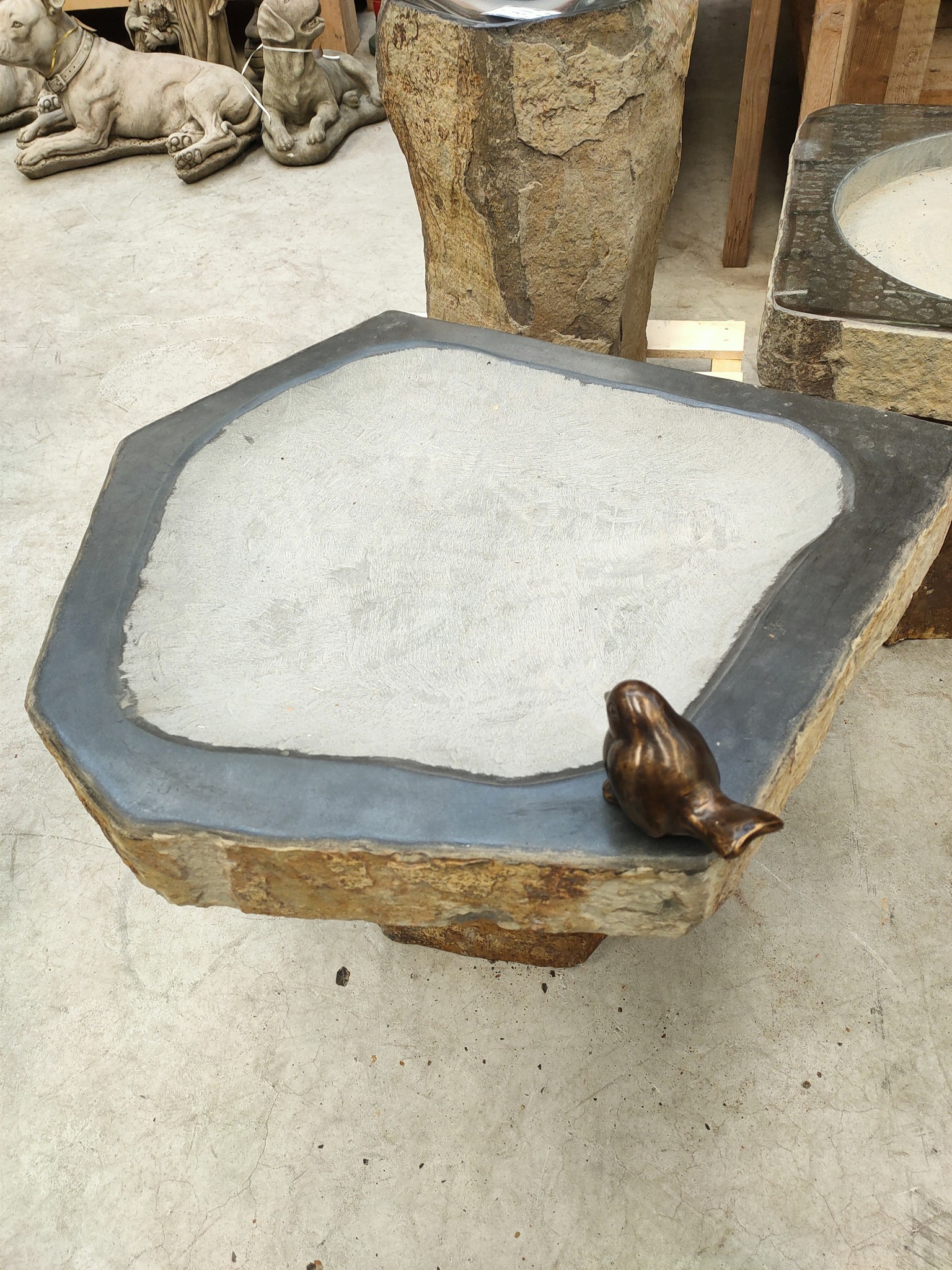 Schön im Garten zu sehen; Badende und trinkende Vögel… eine Vogeltränke ist eine Lösung und zugleich eine Zierde in Ihrem Garten. Diese große Modell-Vogeltrinkschale aus Beton wird ein Leben lang halten, da sie aus Basaltstein gefertigt ist. Diese Vogelschale hat eine verspielte Form, da sie aus einem Basaltsteinblock besteht, der direkt aus der Felswand gehauen wurde. Ausgestattet mit einem Bronzevogel.
