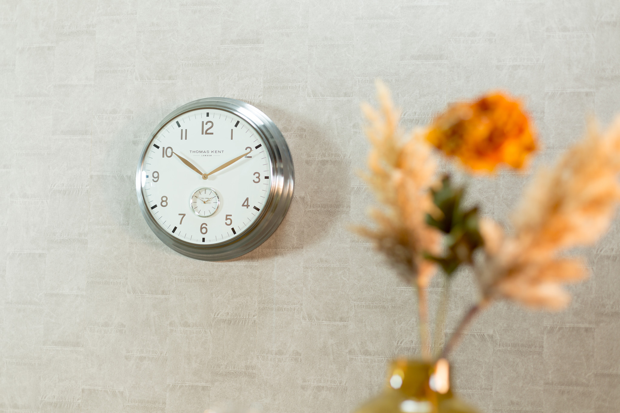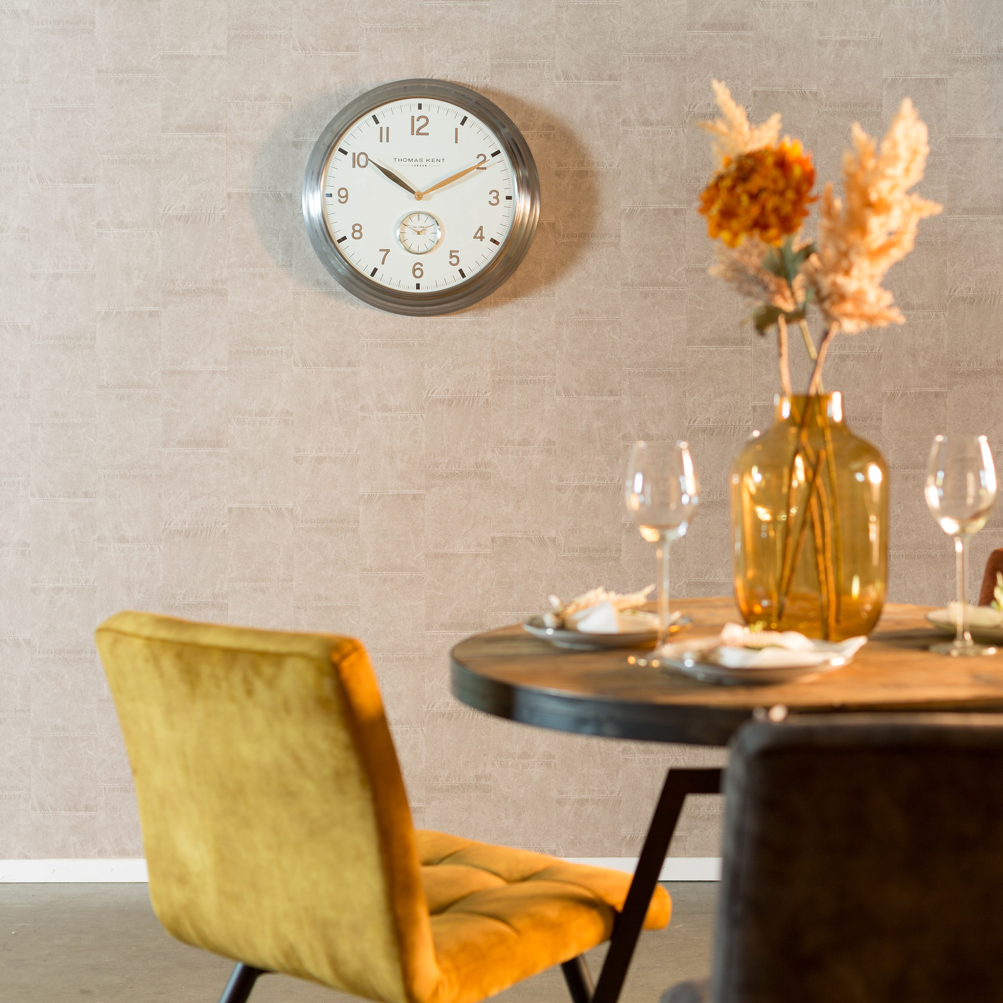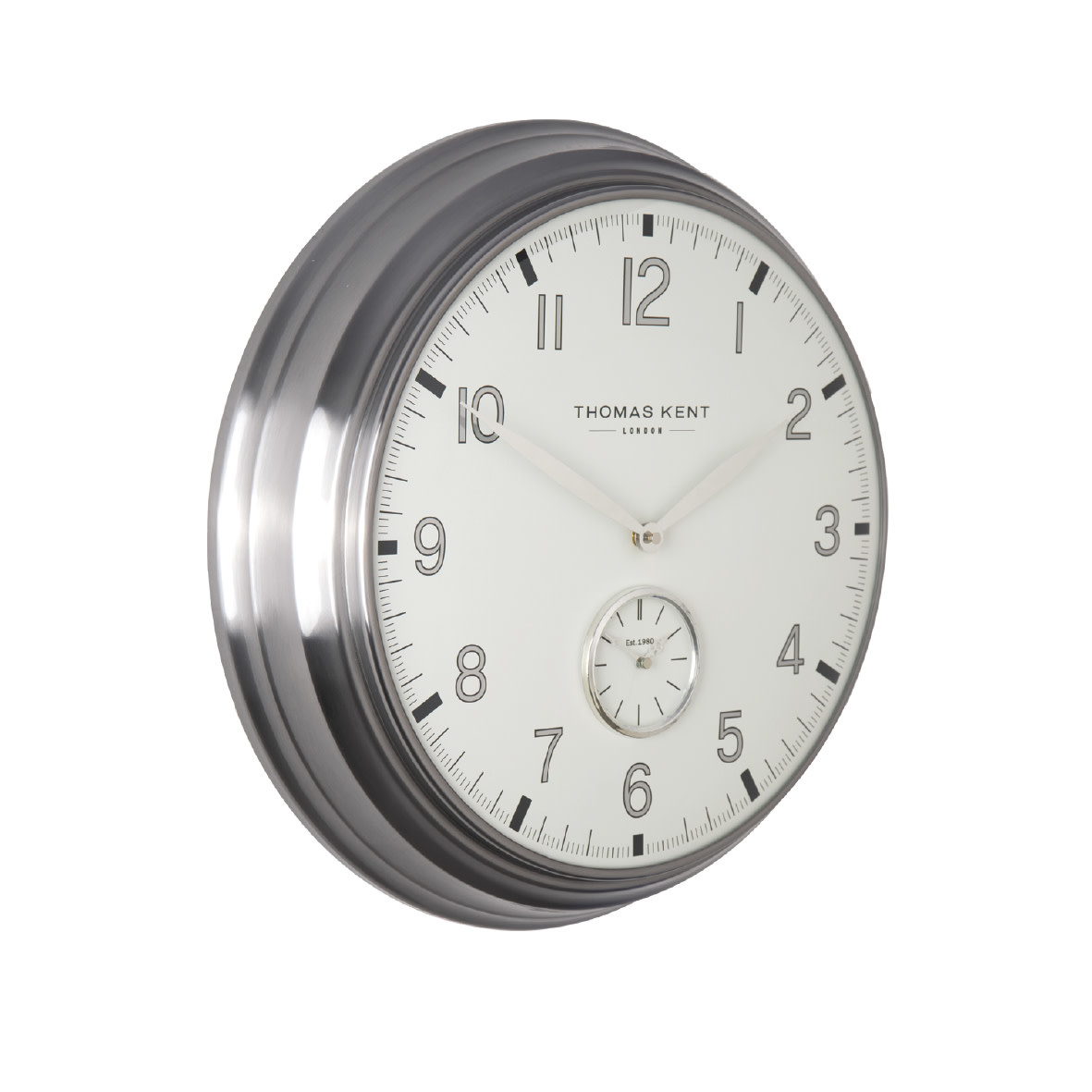 Diese Wanduhr der englischen Marke Thomas Kent ist eine sehr moderne Uhr im klassischen Look.