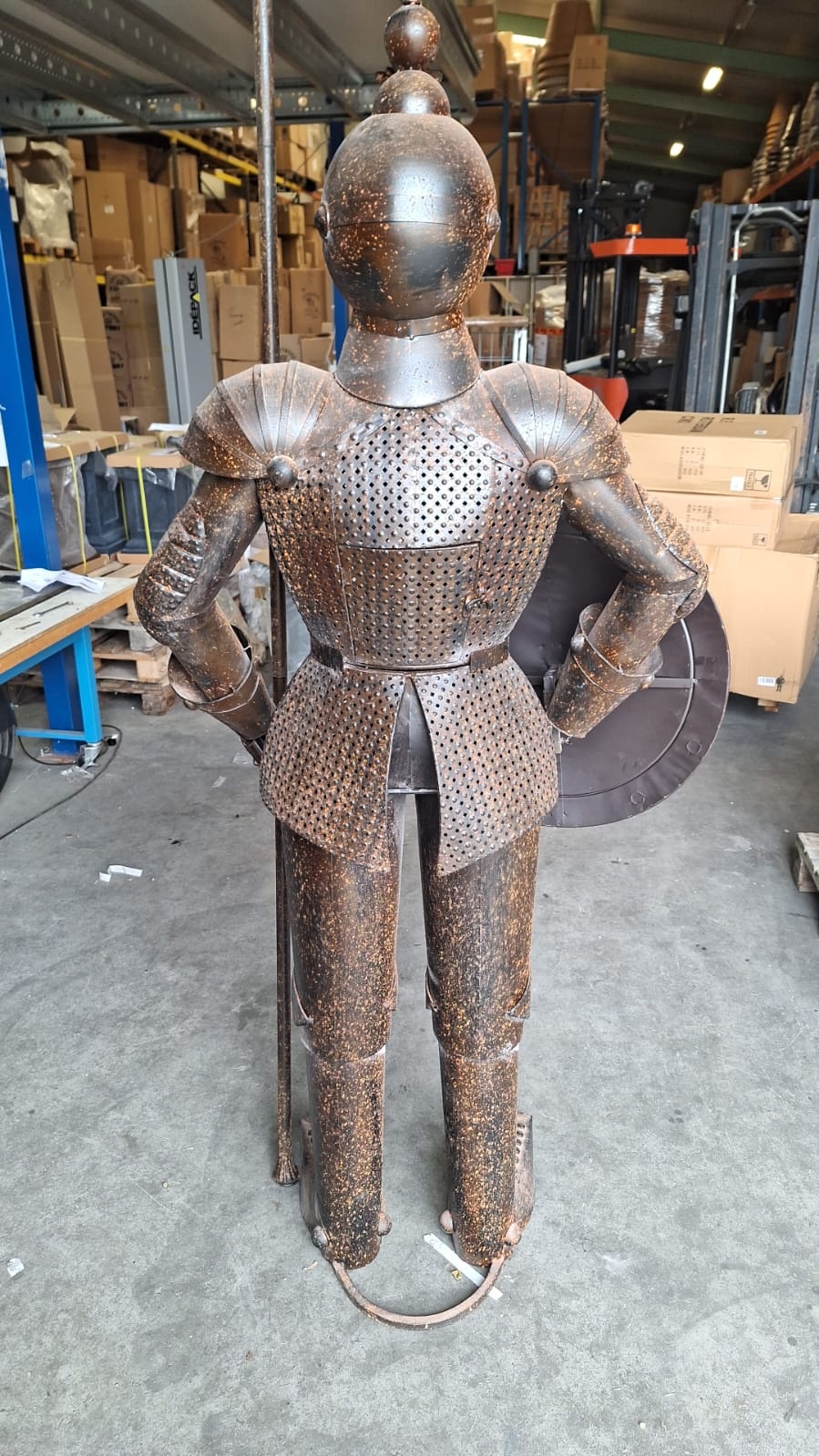 Wenn das nicht schön ist, dann diese große Rüstung mit Lanze und Schild aus dem Mittelalter, hergestellt aus dünnem Stahl mit Nägeln.