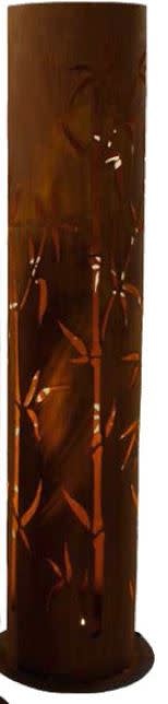 Diese beleuchtete Säule sorgt für eine besondere Atmosphäre in Ihrem Garten. Auf diesem Sockel sind Bambussprossen zu sehen, durch die im Dunkeln warmweißes Licht scheint. Diese Säule besteht aus 2 mm dickem, unbehandeltem Eisen, was ihr eine schöne und zeitlose (rost-)braune Farbe verleiht.