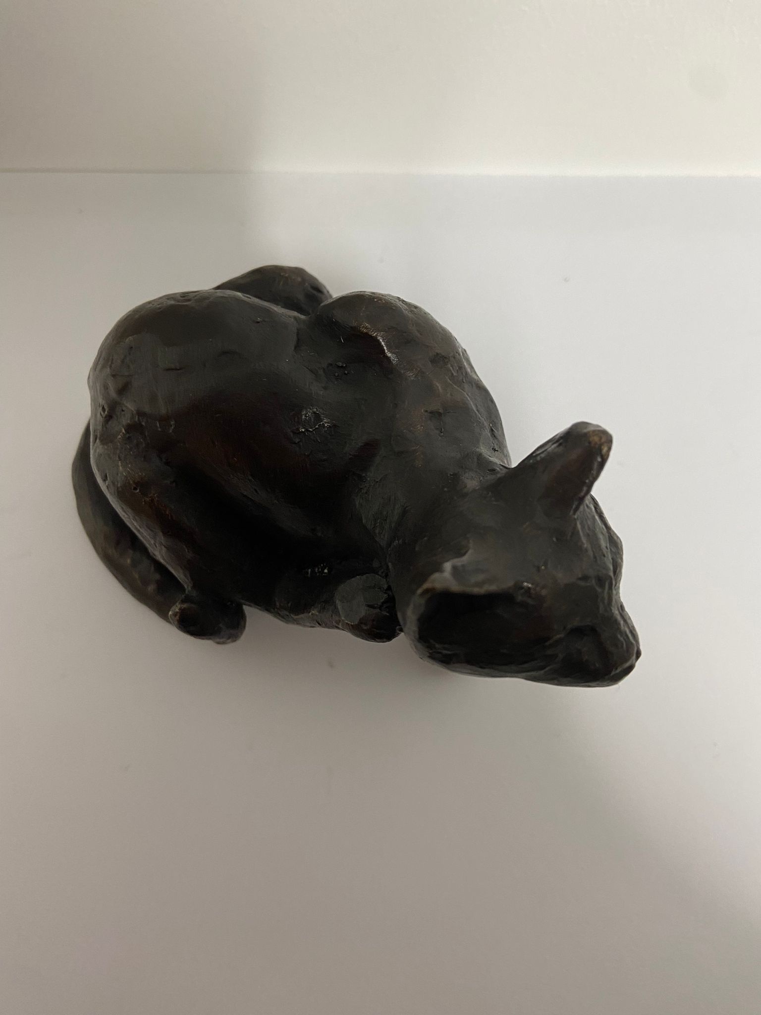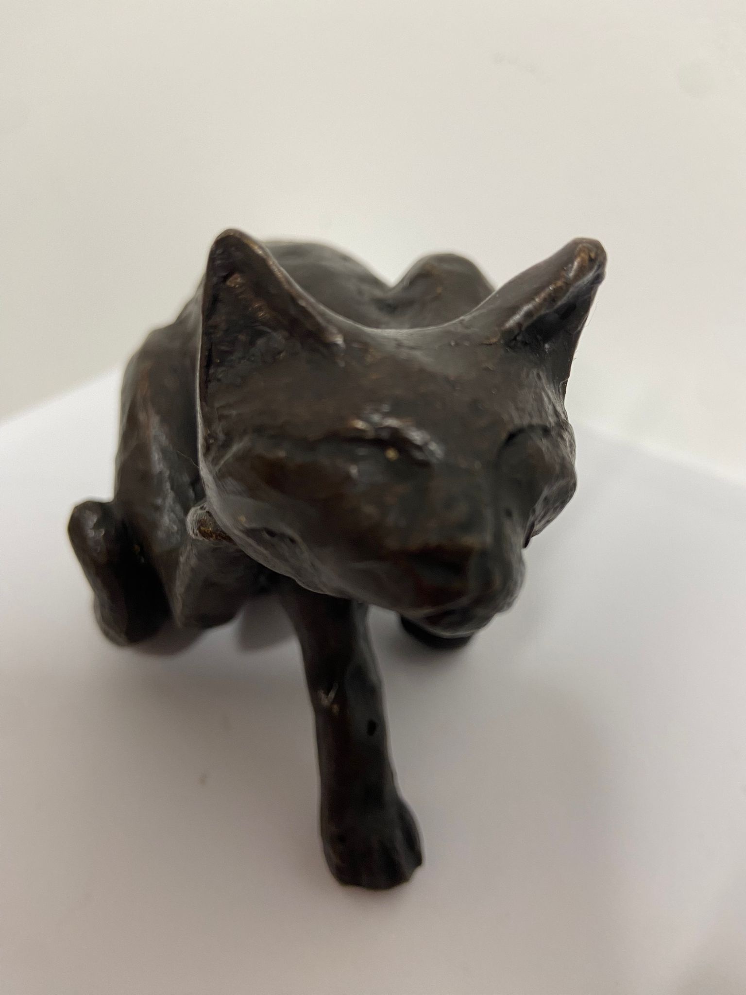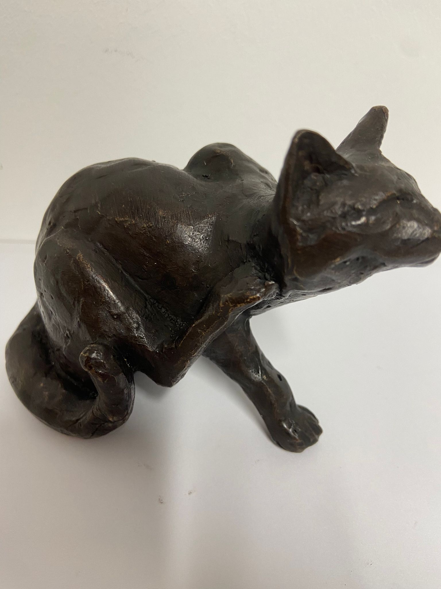 Wunderschöne moderne Skulptur einer kratzenden Katze in kleiner Größe. Hergestellt aus 100 % hochwertiger Bronze mit einem Kupferanteil von mindestens 75 %, was eine sehr lange Lebensdauer und keine unschönen Flecken garantiert. Ein schönes und langlebiges Dekorationsobjekt für Ihr Zuhause, Ihr Geschäft oder Ihren Garten, eignet sich aber auch wunderbar als Geschenk.