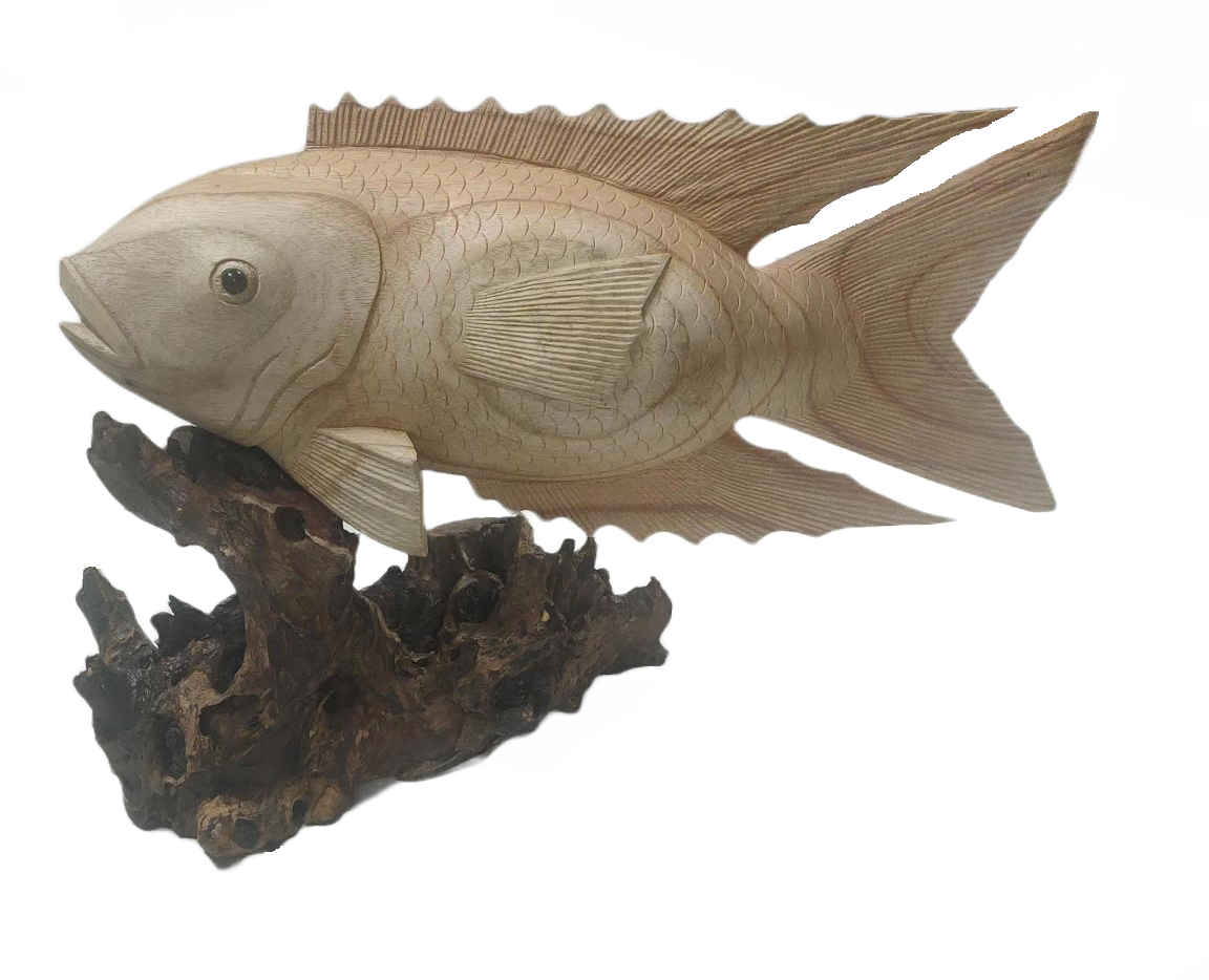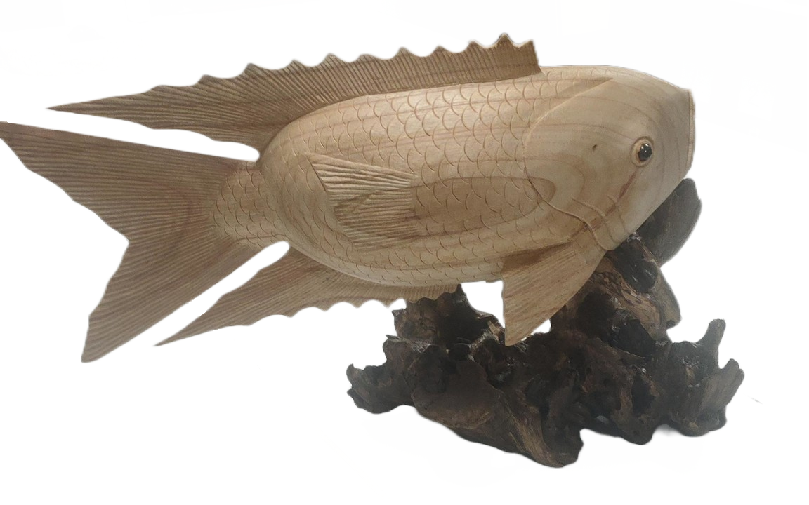 Diese Holzstatue eines Fischkarpfens ist wunderschön gestaltet und es wurde auf jedes kleinste Detail geachtet, wie zum Beispiel die hauchdünnen Flossen. Dieses dekorative Stück wird eine attraktive Ergänzung für jedes Haus und jeden Garten sein.