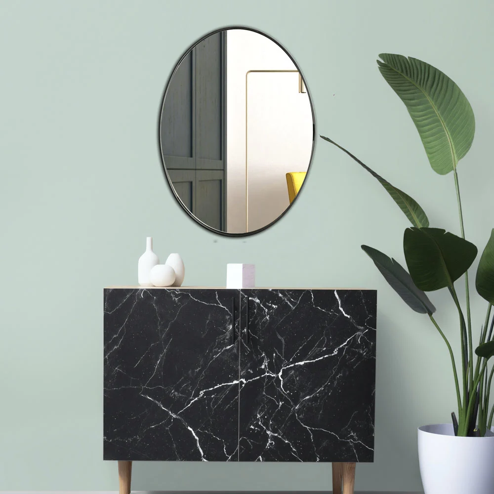 Der Spiegel ist von hoher Qualität und besteht aus Glas und Metall. Die Farbe des Rahmens ist schwarz und der Spiegel hat einen dünnen, matten Rahmen.