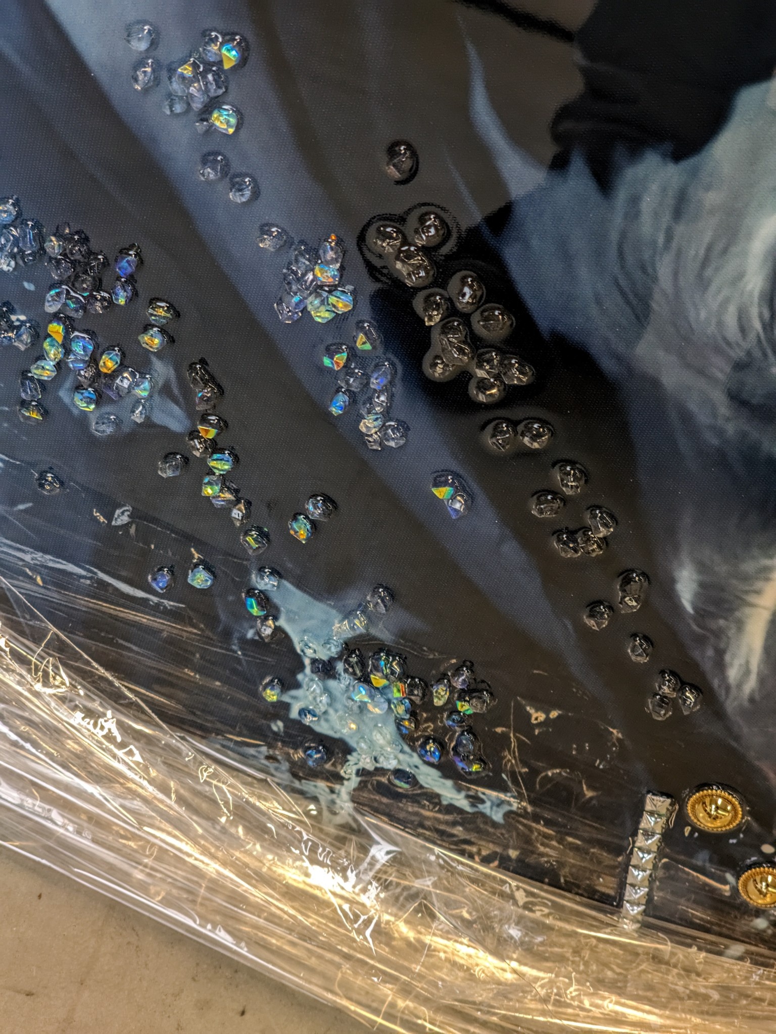 Abschließend wird eine dünne UV-beständige Folie über die gesamte Leinwand gespannt und anschließend abgesaugt. Das Ergebnis ist ein wunderschönes seidenmattes Gemälde, bei dem die Strasssteine für einen angesagten, aber auch eleganten Look sorgen