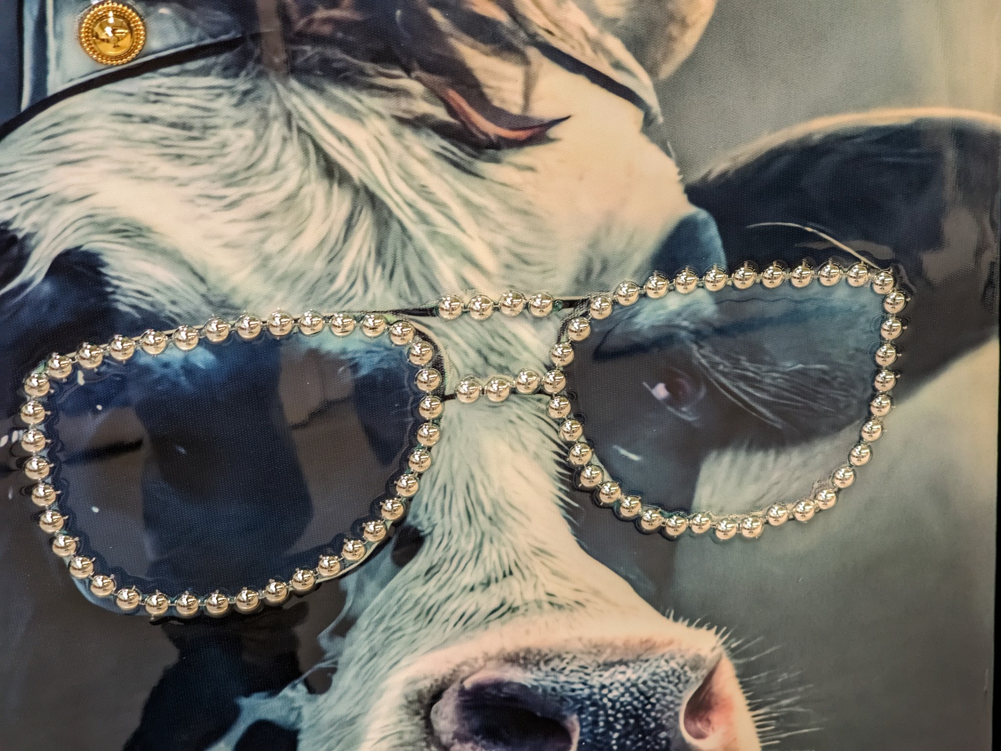 Suchen Sie ein hypermodernes Leinwandgemälde mit verschiedenen Strass-Akzenten? Dann ist dieses Modelgemälde mit einer cool gekleideten Kuh genau das Richtige für Sie. Dieses hohe Leinwandgemälde hat sehr schöne Akzente mit Steinen auf dem Anzug und der Brille der Kuh, wurde sorgfältig mit den schönsten Farbkompositionen und mit viel Liebe zum letzten Schliff angefertigt!
