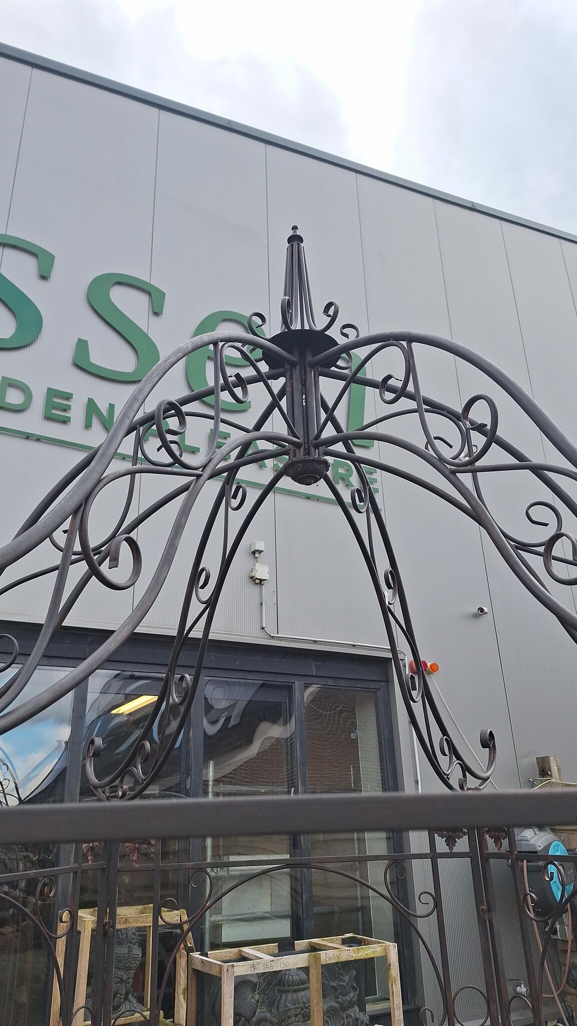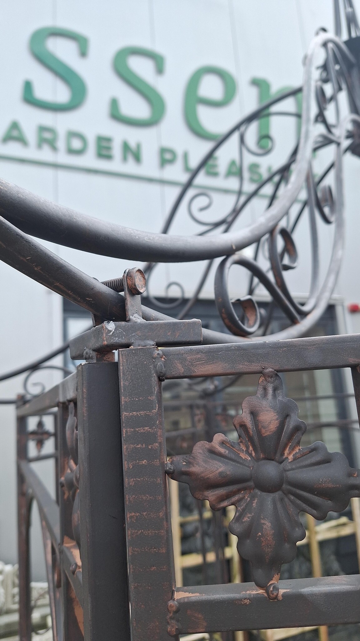 Mooi sierlijk gevormd tuinprieël van zwart/bruin gecoat ijzer.