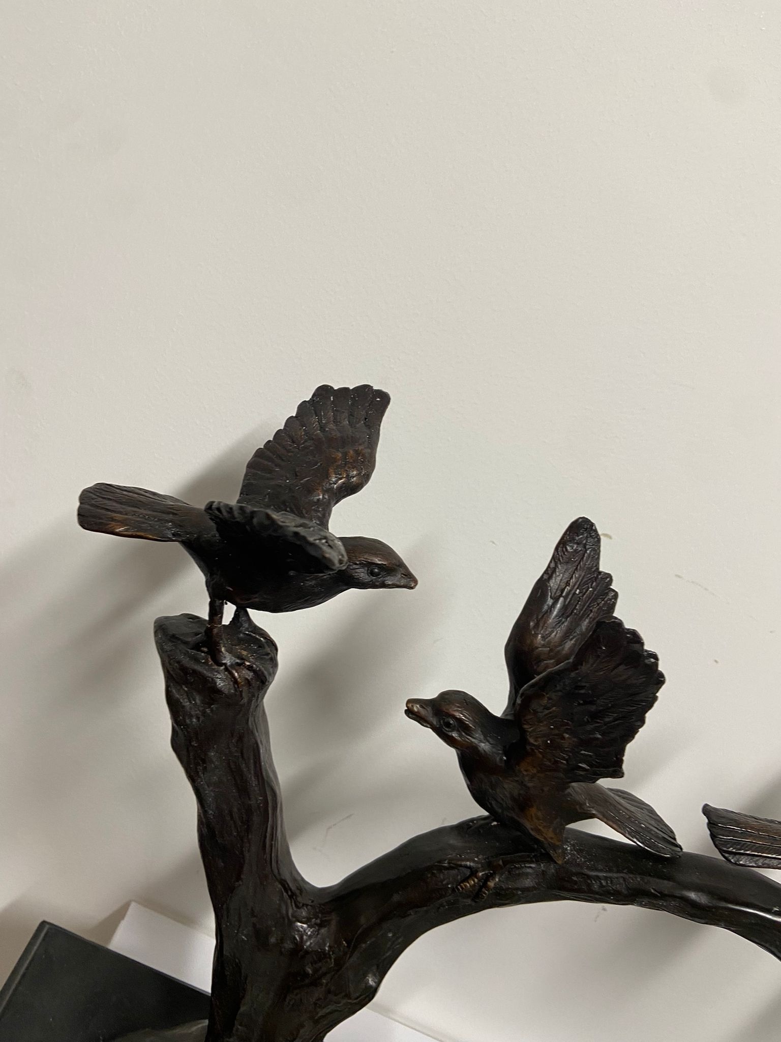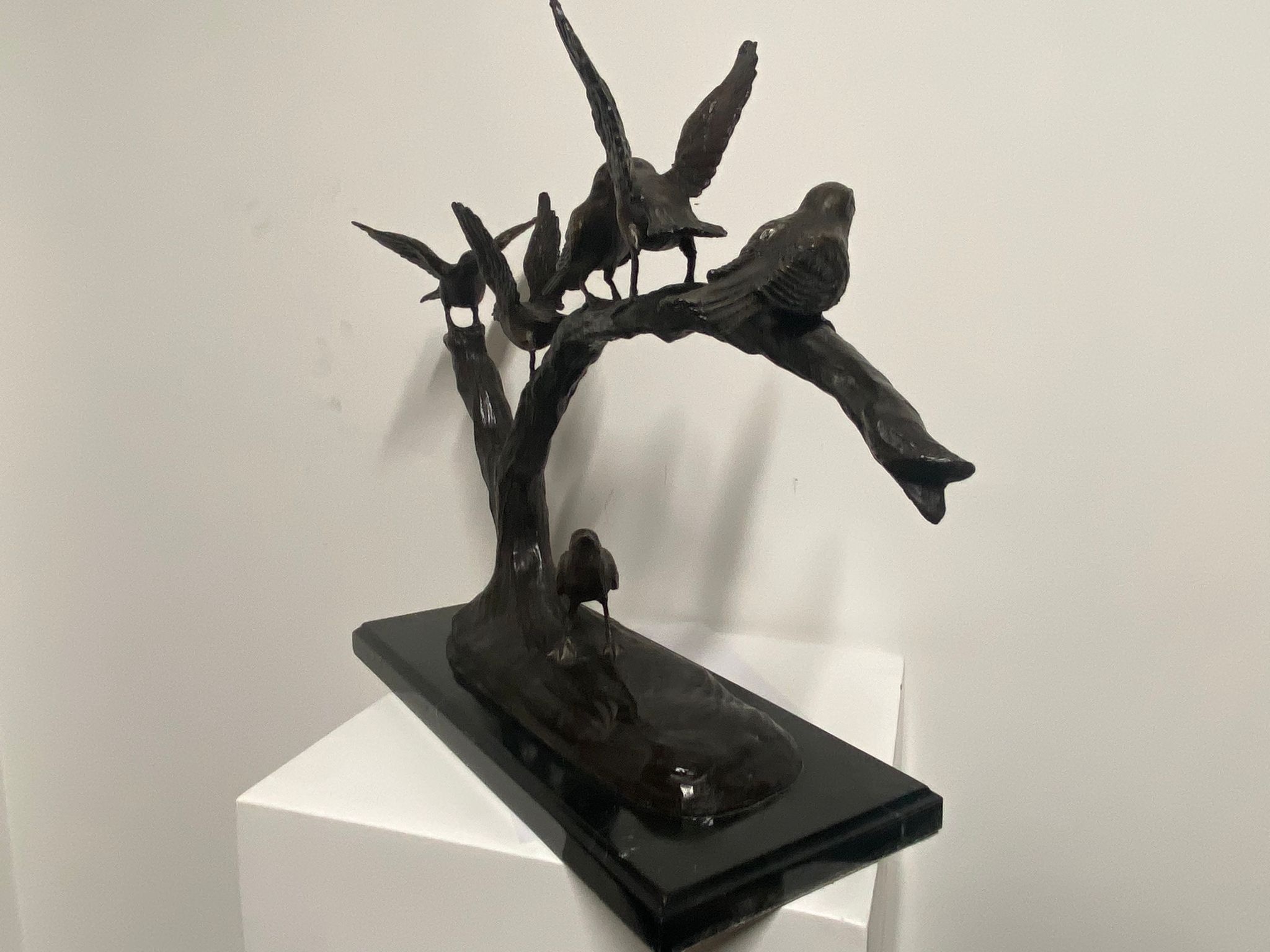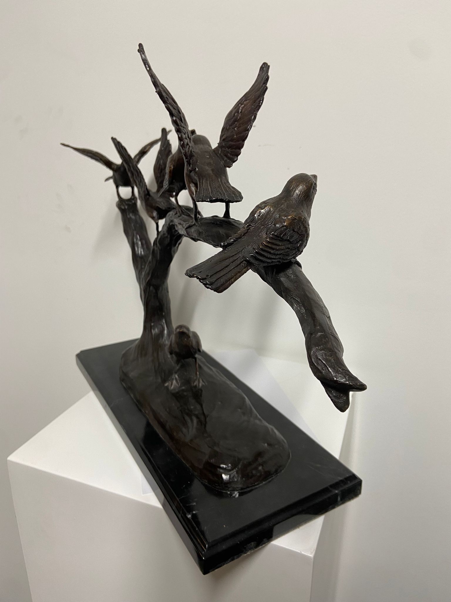 Wunderschöne moderne Skulptur von 6 Vögeln auf einem Ast im Großformat. Hergestellt aus 100 % hochwertiger Bronze mit einem Kupferanteil von mindestens 75 %, was eine sehr lange Lebensdauer und keine unschönen Flecken garantiert. Ein schönes und langlebiges Dekorationsobjekt für Ihr Zuhause, Ihr Geschäft oder Ihren Garten, eignet sich aber auch wunderbar als Geschenk.