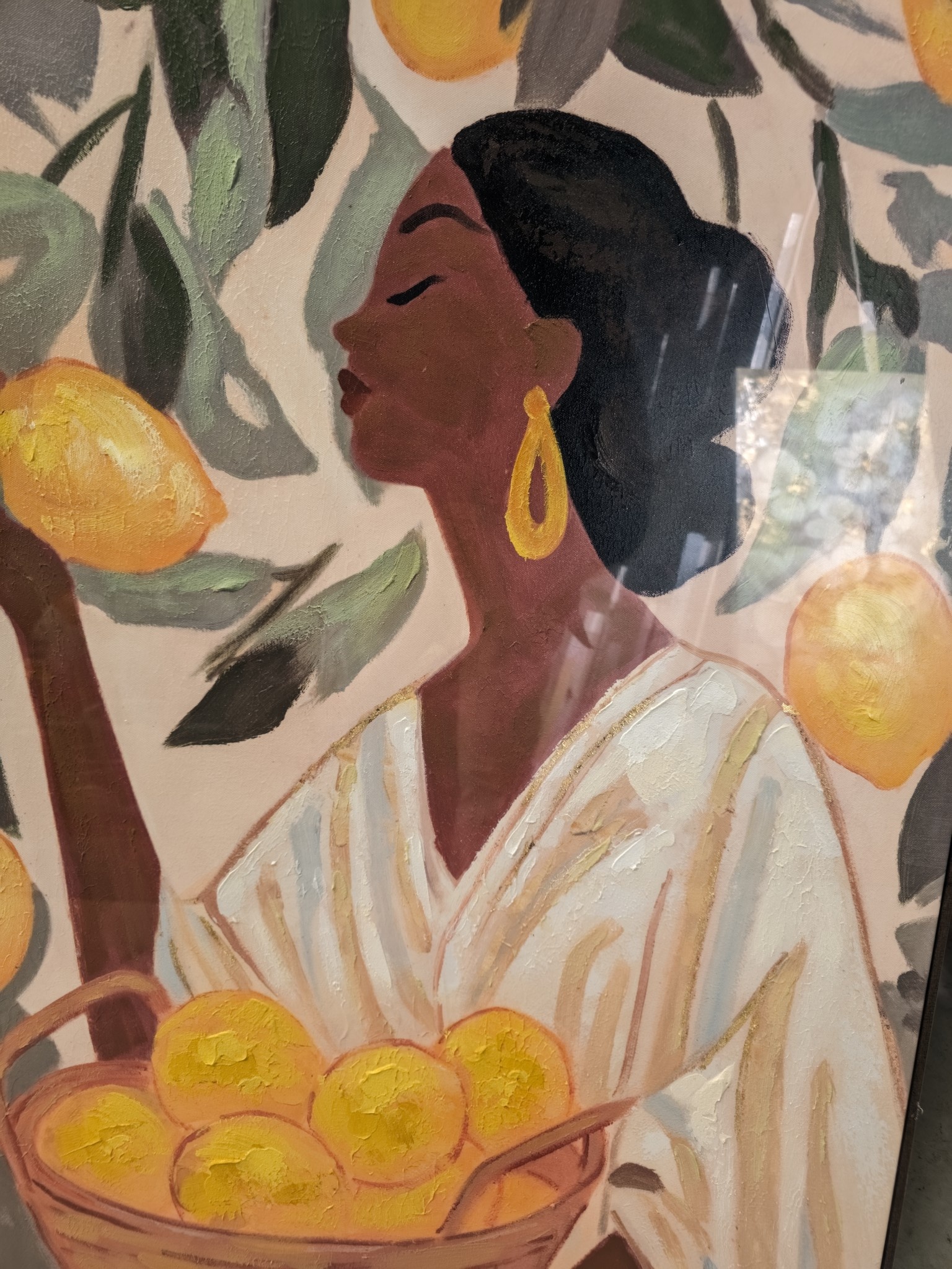 Suchen Sie ein wunderschönes, mit Acrylfarbe bearbeitetes Leinwandgemälde? Dann ist diese Wanddekorationsserie genau das Richtige für Sie. Dieses große Gemälde, das eine schöne Frau mit einem Korb voller Zitronen auf hellem Hintergrund zeigt, wurde sorgfältig mit den schönsten Farbkompositionen und mit viel Liebe zum letzten Schliff geschaffen!