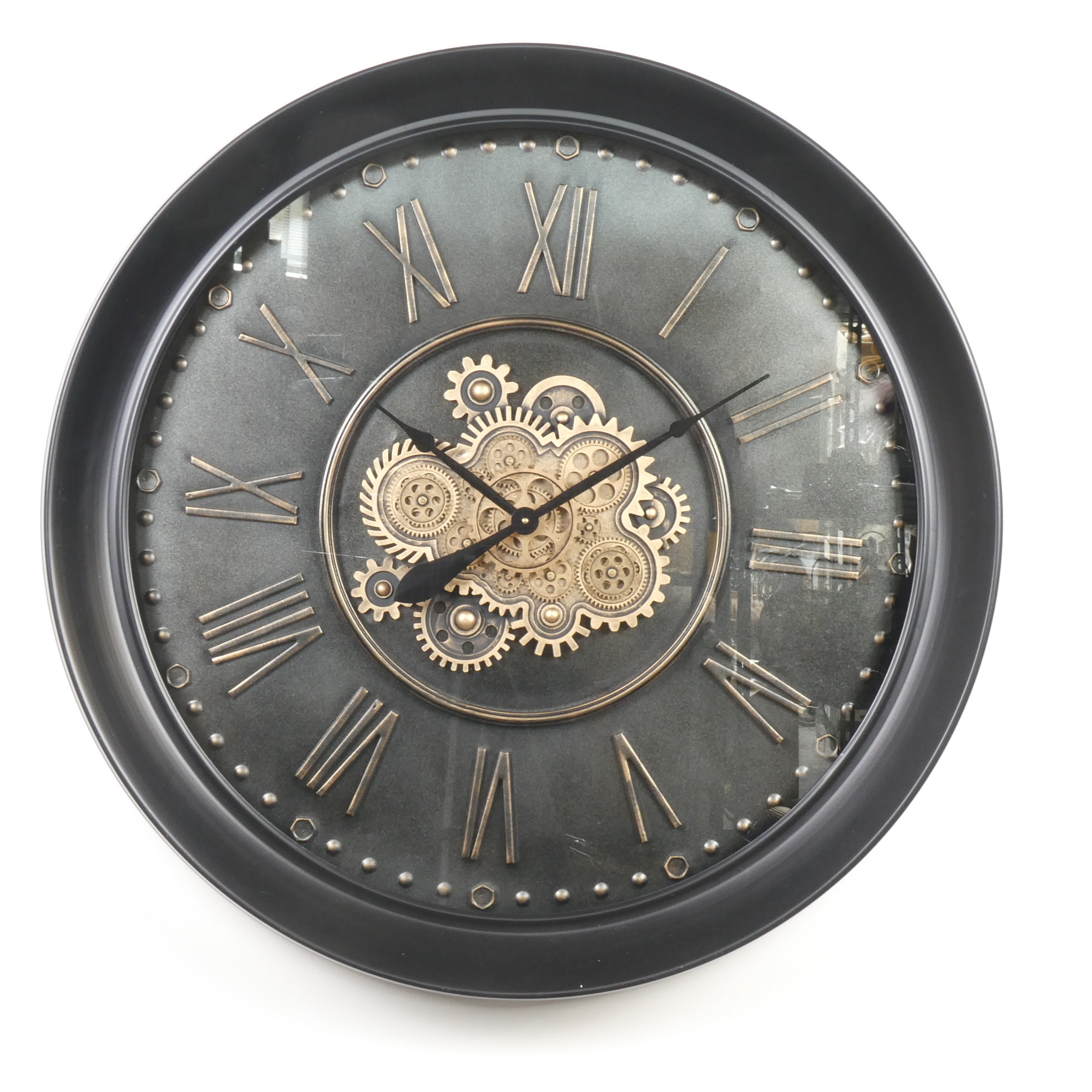 Es wird eine Freude sein, zu sehen, wie spät es jetzt ist, mit dieser extragroßen XXL-dicken, schönen runden schwarz/grauen Wanduhr mit rotierenden Zahnrädern. Diese sehr schöne Uhr hat einen braunen Stahlrahmen mit dezenten Zahlen.