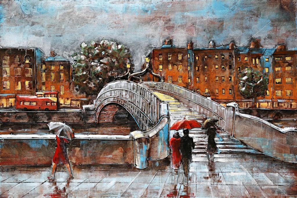 Entirely handmade 3D metal painting; with the image of a bridge in a big city. A very labour-intensive piece of wall decoration!