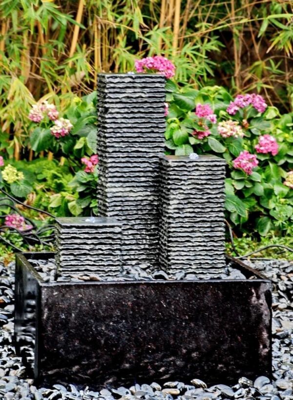Completely granite water feature, 3 square columns, Base of polished gray granite (photo differs), with LED light at the top of the columns, and pump. Surface 60×60, height 75cm in total. Watch out for frost.