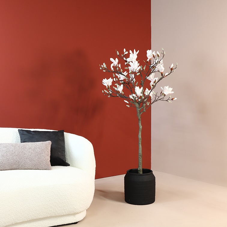 This lifelike model magnolia plant with blooming flowers is made of the finest recycled plastic types, and stands well on its own because of the pot in which the plant stands. This magnolia plant fills empty spaces very quickly because of its great height and wide fanning. Combined with other silk plants, together in 1 large pot you can make a beautiful plant arrangement, which you no longer have to worry about.