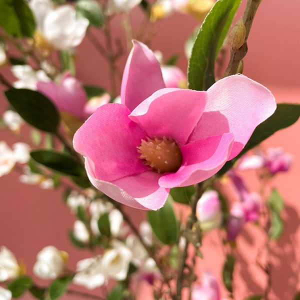 This lifelike model magnolia plant with blooming flowers is made of the finest recycled plastic types, and stands well on its own because of the pot in which the plant stands. This magnolia plant fills empty spaces very quickly because of its great height and wide fanning. Combined with other silk plants, together in 1 large pot you can make a beautiful plant arrangement, which you no longer have to worry about.