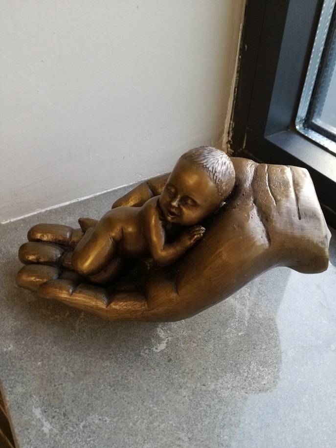 Beautiful image of a sleeping baby in a life-sized hand made of high-quality bronze with a minimum copper content of 75%, which guarantees a very long life.