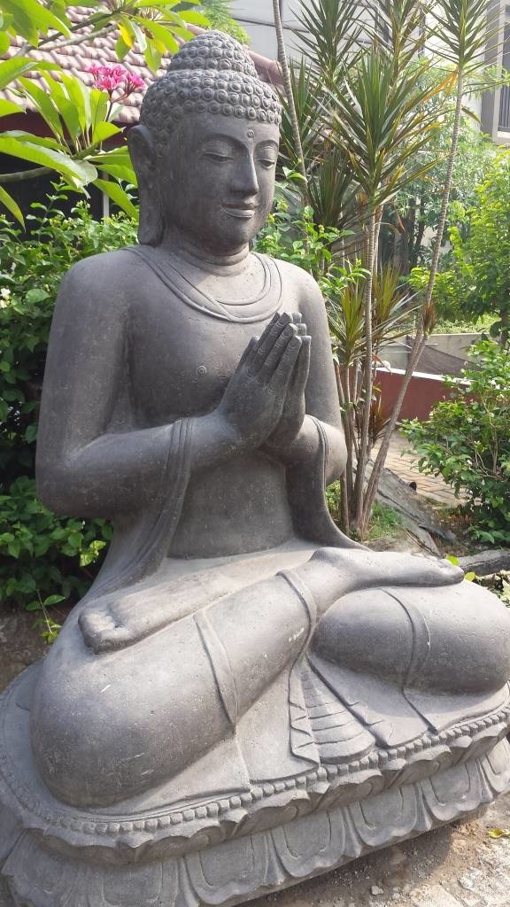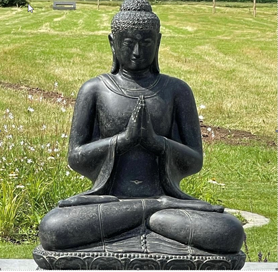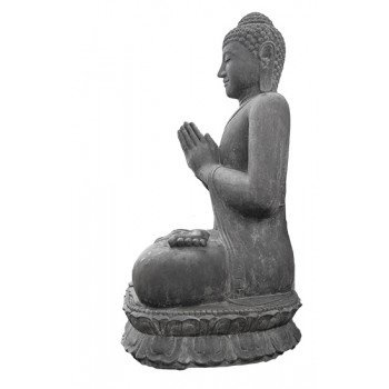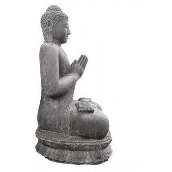 Beelden uit deze serie zijn allemaal gemaakt van hoogwaardig gietsteen met een zeer hoog cement gehalte, waardoor al deze beelden met gemak alle weersinvloeden kunnen weerstaan. De kleur is zwart/bruin en kan altijd wat afwijken van de foto omdat heel deze serie handgemaakt is. Deze groetende, zittende boeddha op lotus bloem is leverbaar in 5 maten, tot 200cm hoog !!