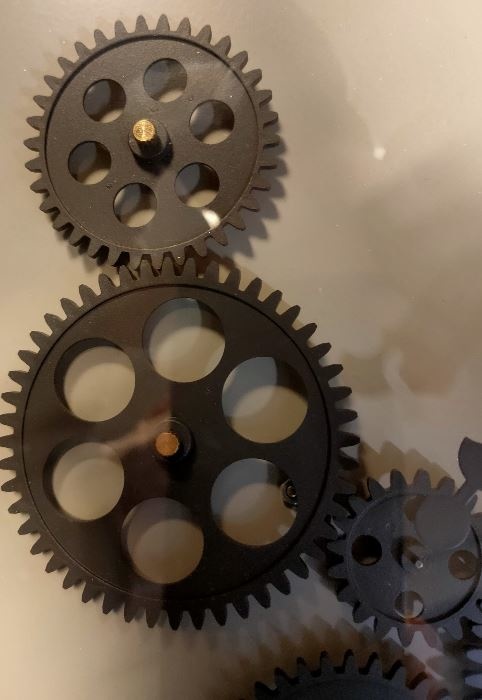 Clock is old gold in color and gearbox the same. This wall clock is equipped with many gears, which turn smoothly, which gives a playful effect, you can watch that rotating game for hours.