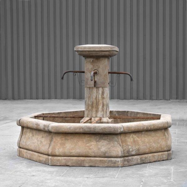 With this octagonal village fountain you can create a beautiful warm atmosphere in your garden or company in a central location, especially when it is dark and an underwater spotlight is provided so that the water jets from the pipes and water supply are beautifully illuminated. This model fountain is made after an original model of an old farm and village fountain.