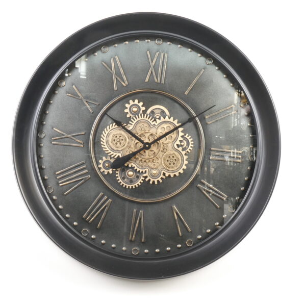 It will be a pleasure to check what time it is now, with this extra large XXL thick beautiful round black/gray colored wall clock with rotating gears. This very beautiful clock has a steel frame in a brown color, with subtle numbers.