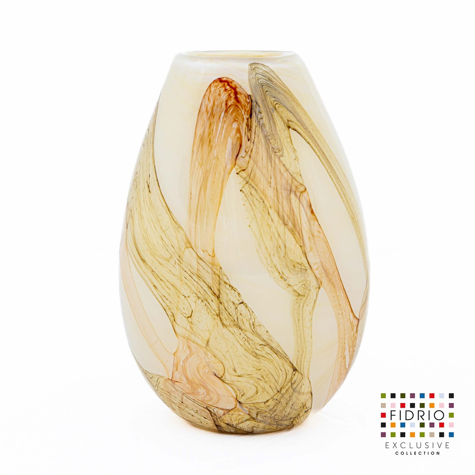 All fidrio glass vases are made manually in the traditional, artisanal way. The workable super hot glass is blown into a wooden mold, where the mold serves as the basic shape, but the color shades and therefore the appearance will be different for each vase. The specified sizes are always approximately sizes.