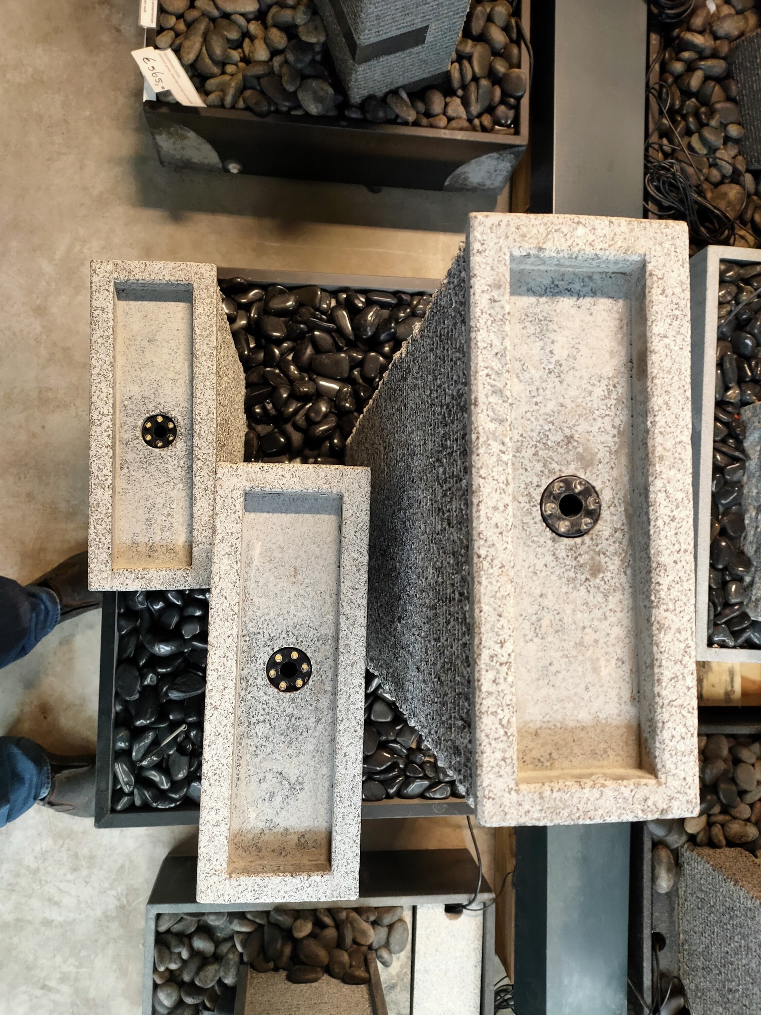 No digging is required for this model because the water supply is located in the container. A large hole with a stainless steel cover has been made in the bottom plate for easy access to the pump. Comes complete with pump, hose, water distributor, LEDs, instructions for use and black finishing stones. For complete operation you need 2 sockets.