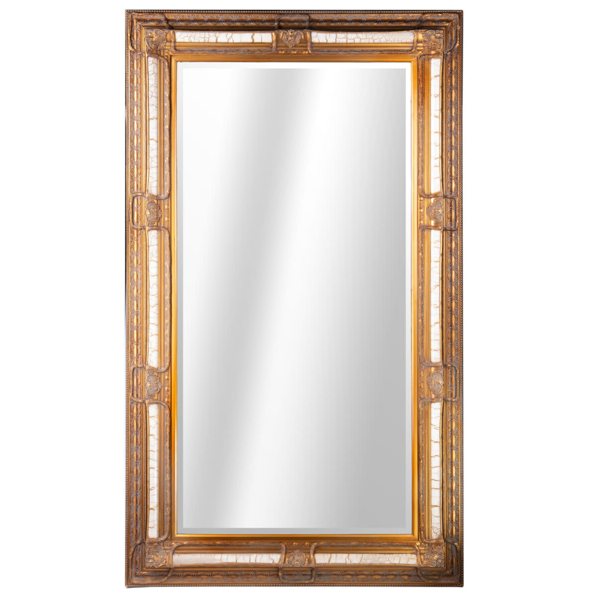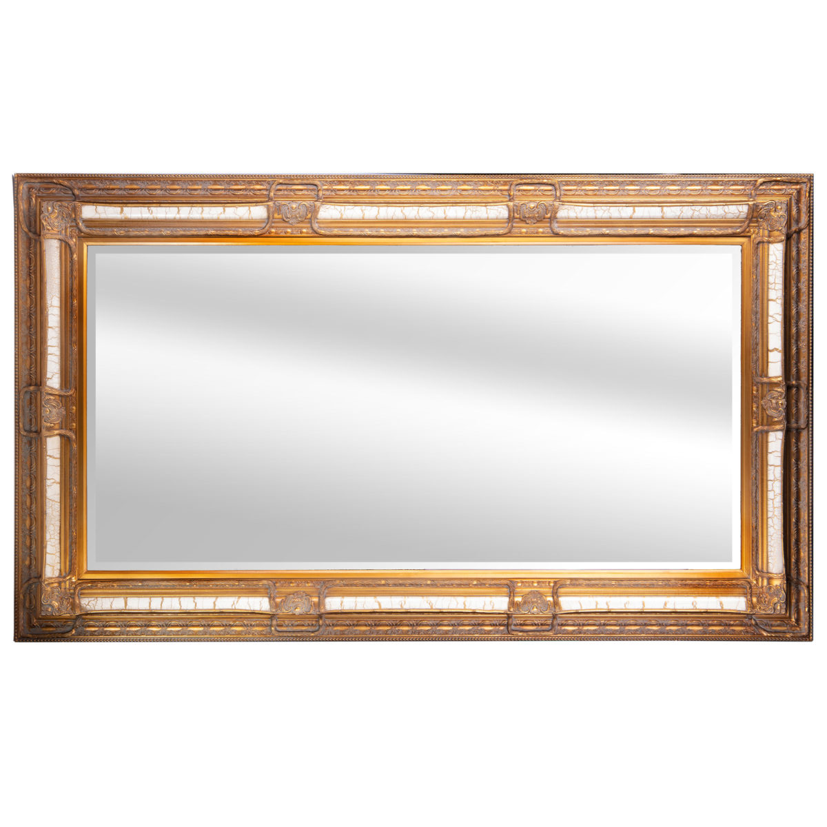 Beautiful, refined, extra large classic rectangular mirror in a gold color. The mirror glass is super clear and has a beautiful faceted edge. The classic frame is made of wood, which has a beautiful appearance. This rectangular baroque mirror can be hung horizontally, but also vertically.