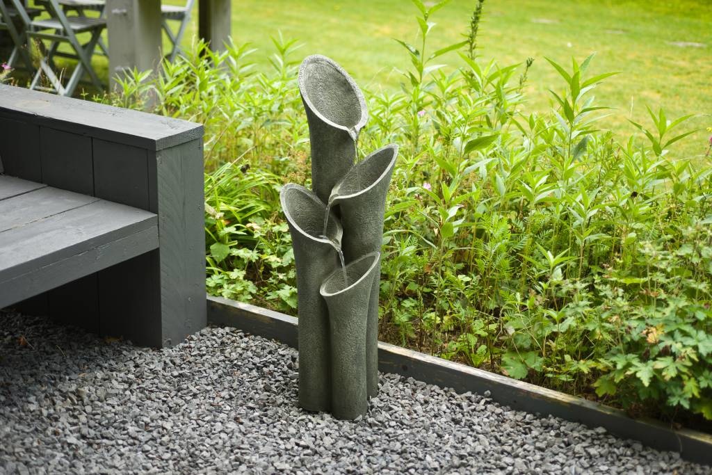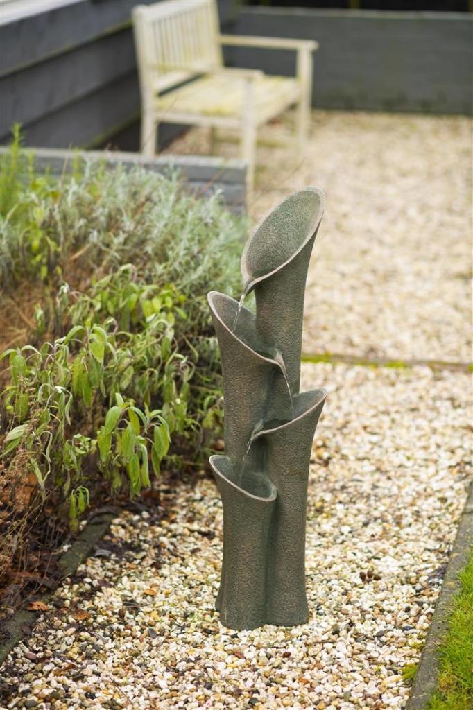 Modern high terrace water feature with a beautiful sleek design. Made entirely of strong polyresin in an ultra-modern greenish color. Supplied with pump. Can be used outdoors as well as indoors.