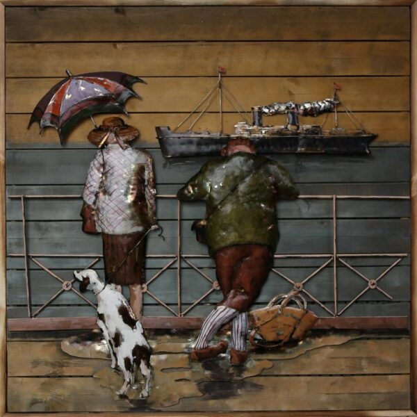 Painting with 2 people on the quay in 3D, the figure above hand made entirely of iron, background is of wood which is painted in a good color combination or decor.