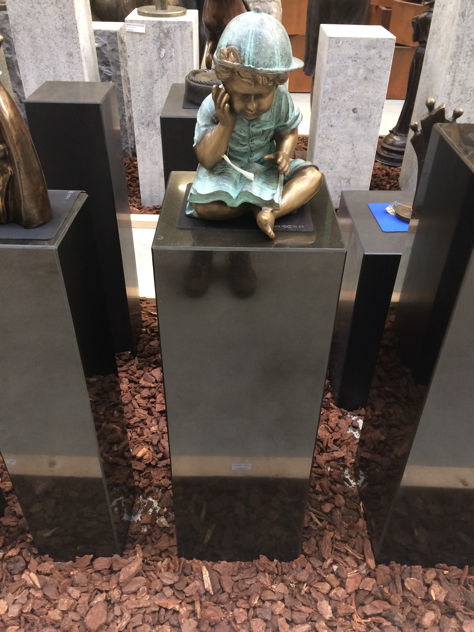 These columns are made of 3 cm thick pitch-black granite, which are then polished, resulting in a high-gloss plinth.