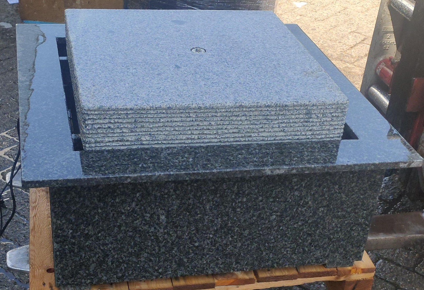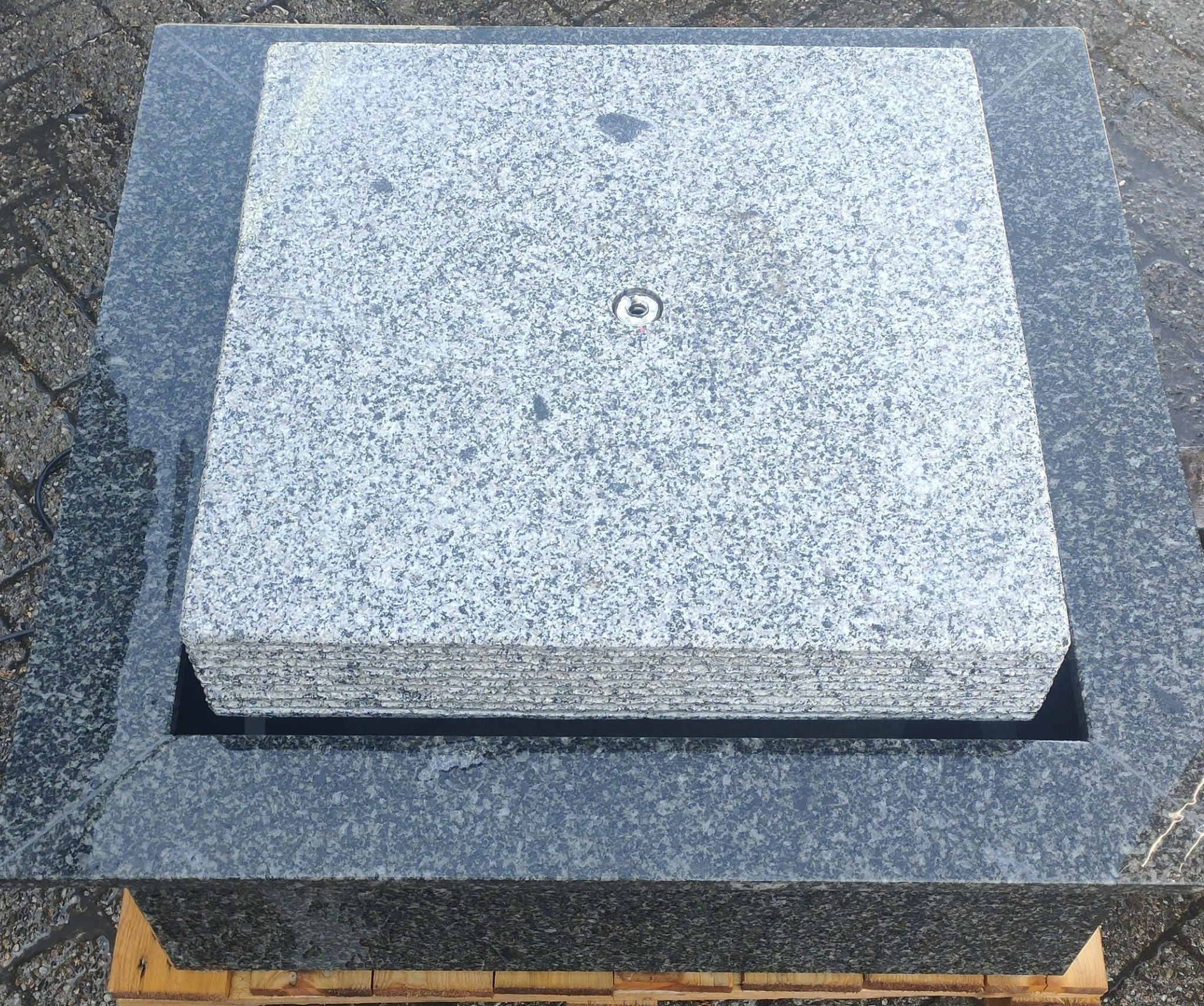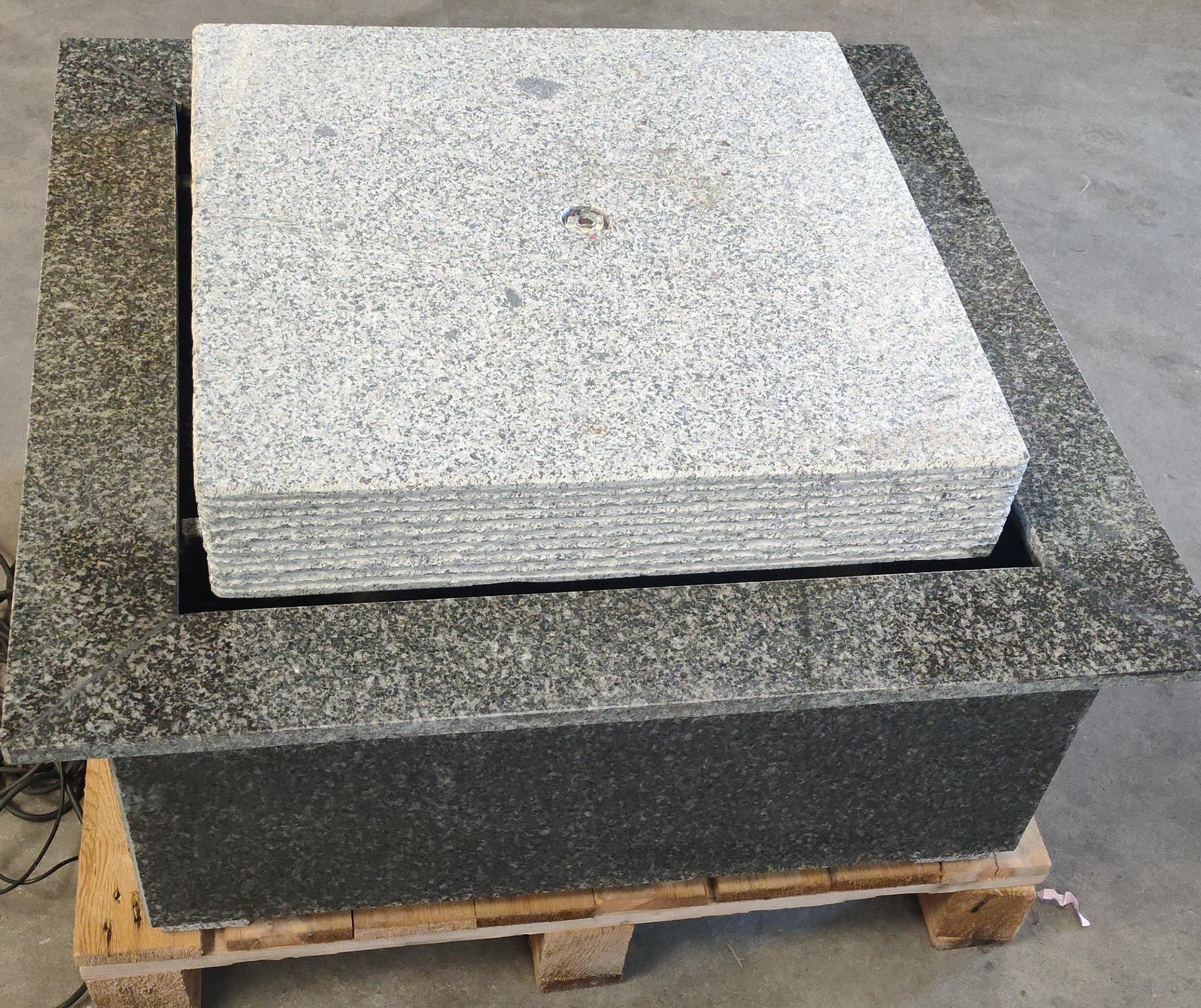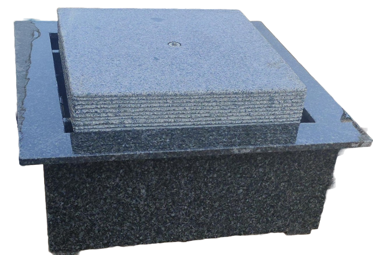 The whole is made of polished granite with LED lighting. 80x80cm Height about 45 cm., Comes complete with pump, hose and LED lighting. This model does not require any digging.