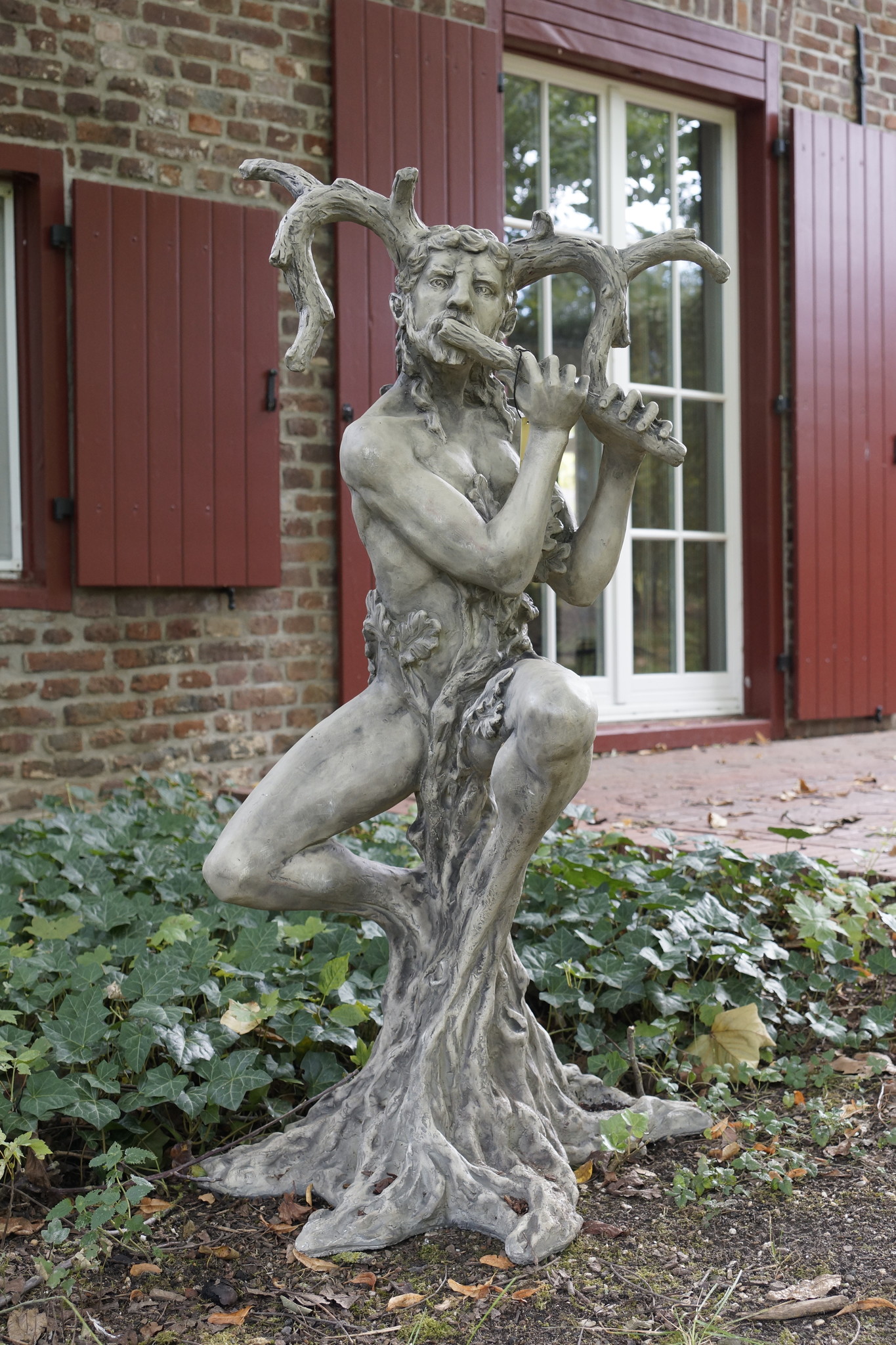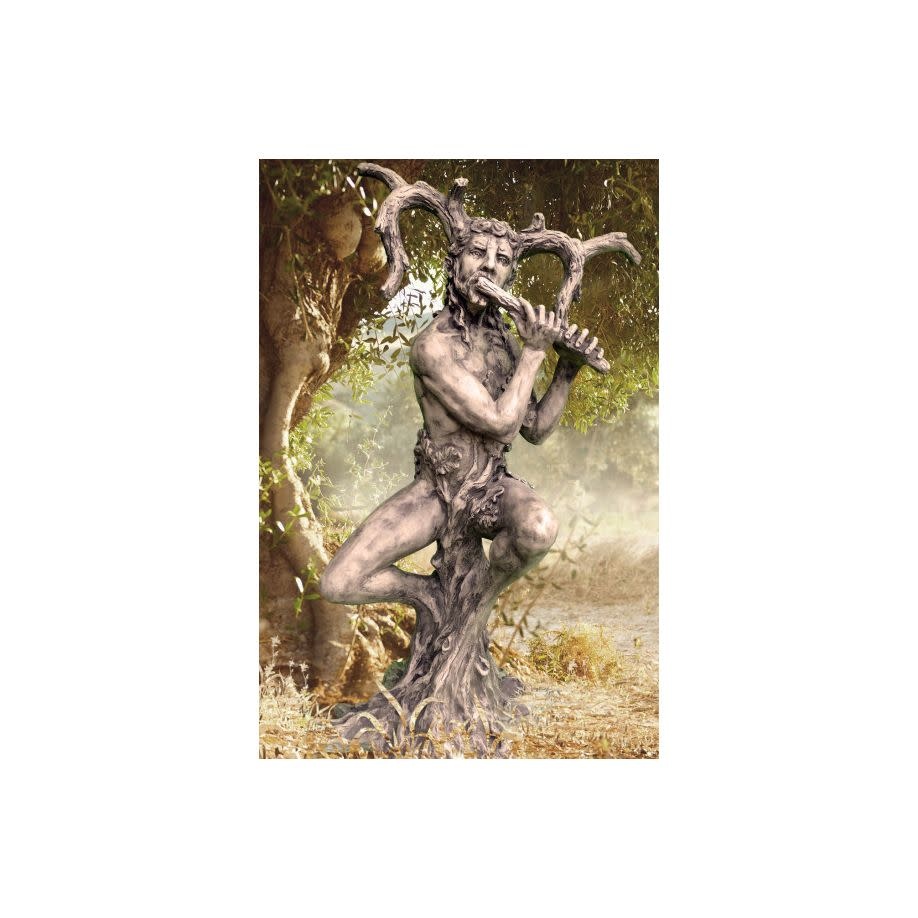 A beautifully designed model garden statue in the shape of a man playing the flute, incorporated in a tree. Made from the very best casting stone.