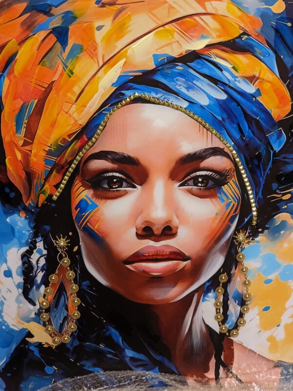 Are you looking for a hyper modern canvas painting with different rhinestone accents? Then this model painting with a beautiful lady with a headscarf is definitely something for you. This square canvas painting has very beautiful accents with stones on the jewelry of the woman, is carefully made with the most beautiful color compositions and with a lot of attention to the finishing touch!