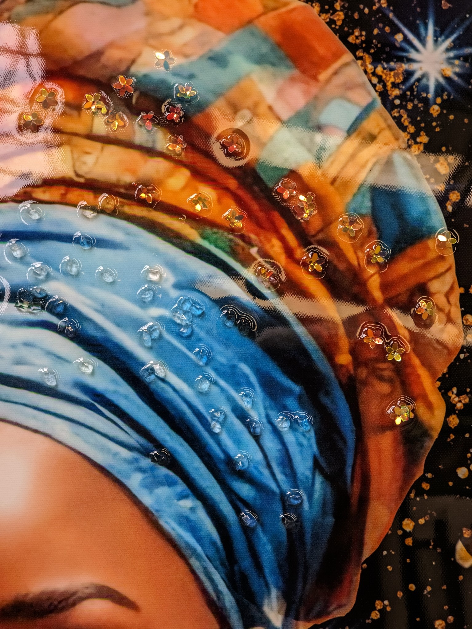 Are you looking for a hyper modern canvas painting with different rhinestone accents? Then this model painting with a beautiful lady on a dark background is definitely something for you. This high canvas painting has very beautiful accents with stones on the jewelry and headscarf of the lady, is carefully made with the most beautiful color compositions and with a lot of attention to the finishing touch!