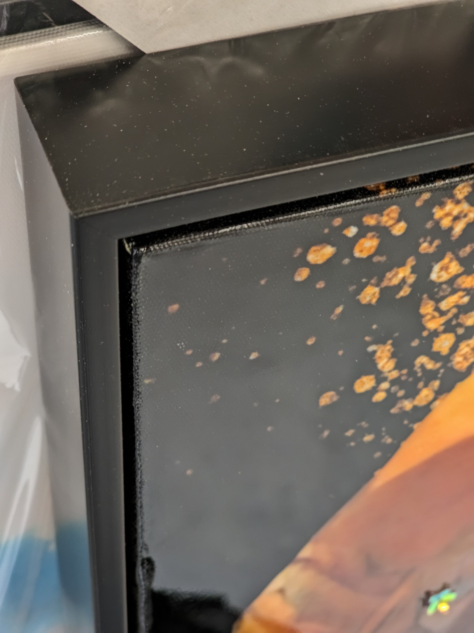 This canvas painting has undergone a very modern process during production. The canvas is printed, then all the stones are glued onto the canvas. The painting is further finished with acrylic paint.