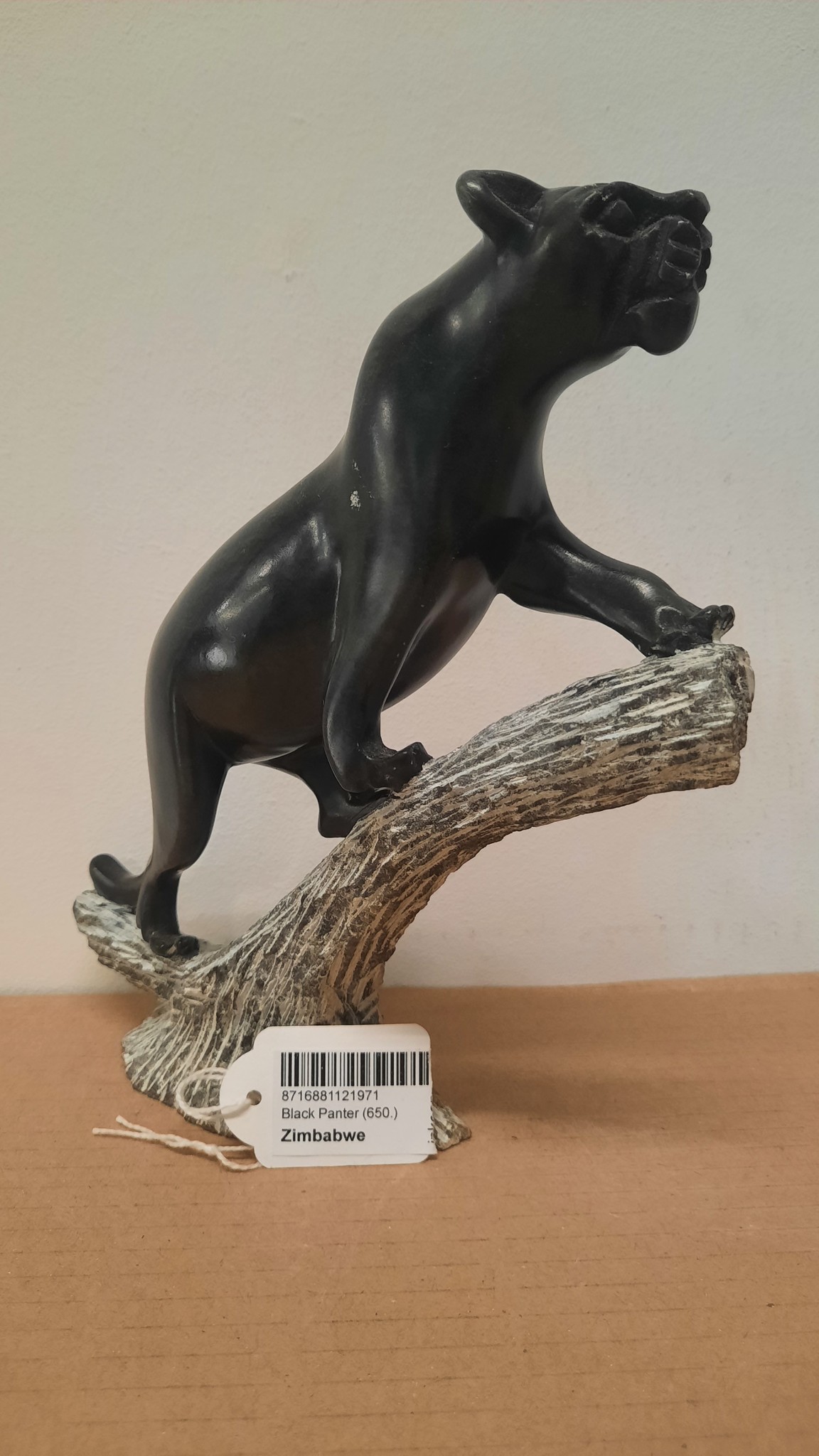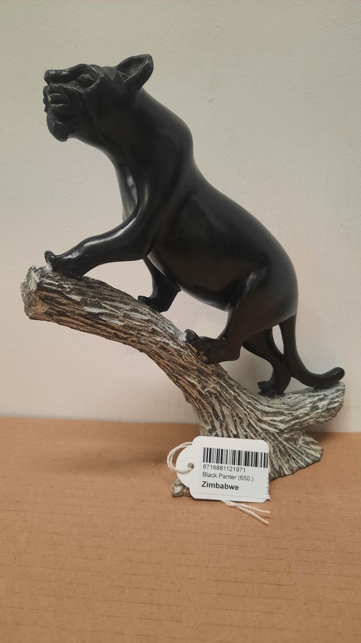 This model statue with the image of a panther walking up a stump may differ from the photo in terms of color and shape, as it is handmade and also a natural material.