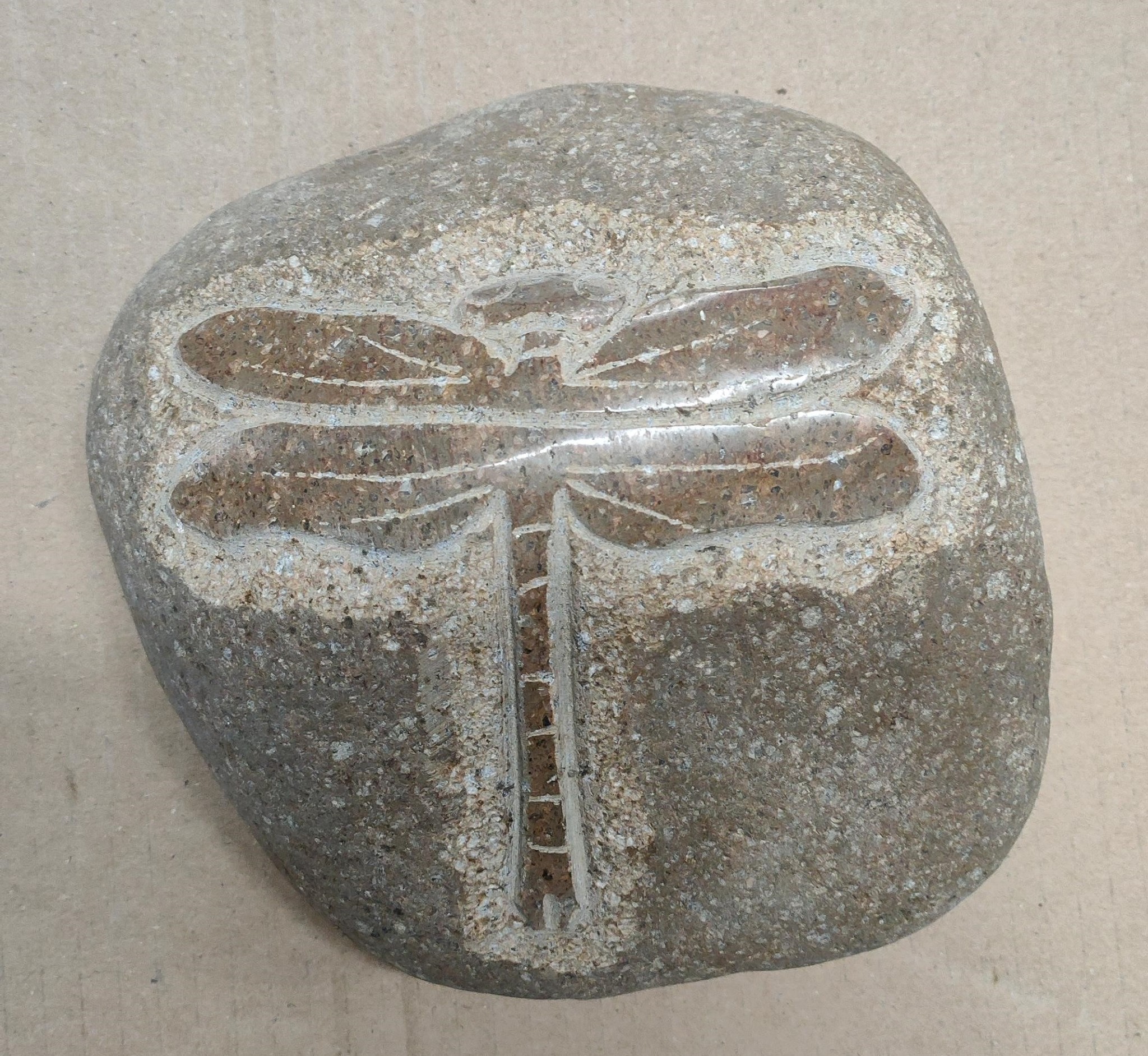 Beautiful boulder with a dragonfly, handmade on a boulder of about 15 cm. First the image is drawn on the boulder, after which the lines and some surfaces are cut out with a chisel, so that differences in depth arise. The highest parts are then carefully polished. A huge job, but the result may be there.