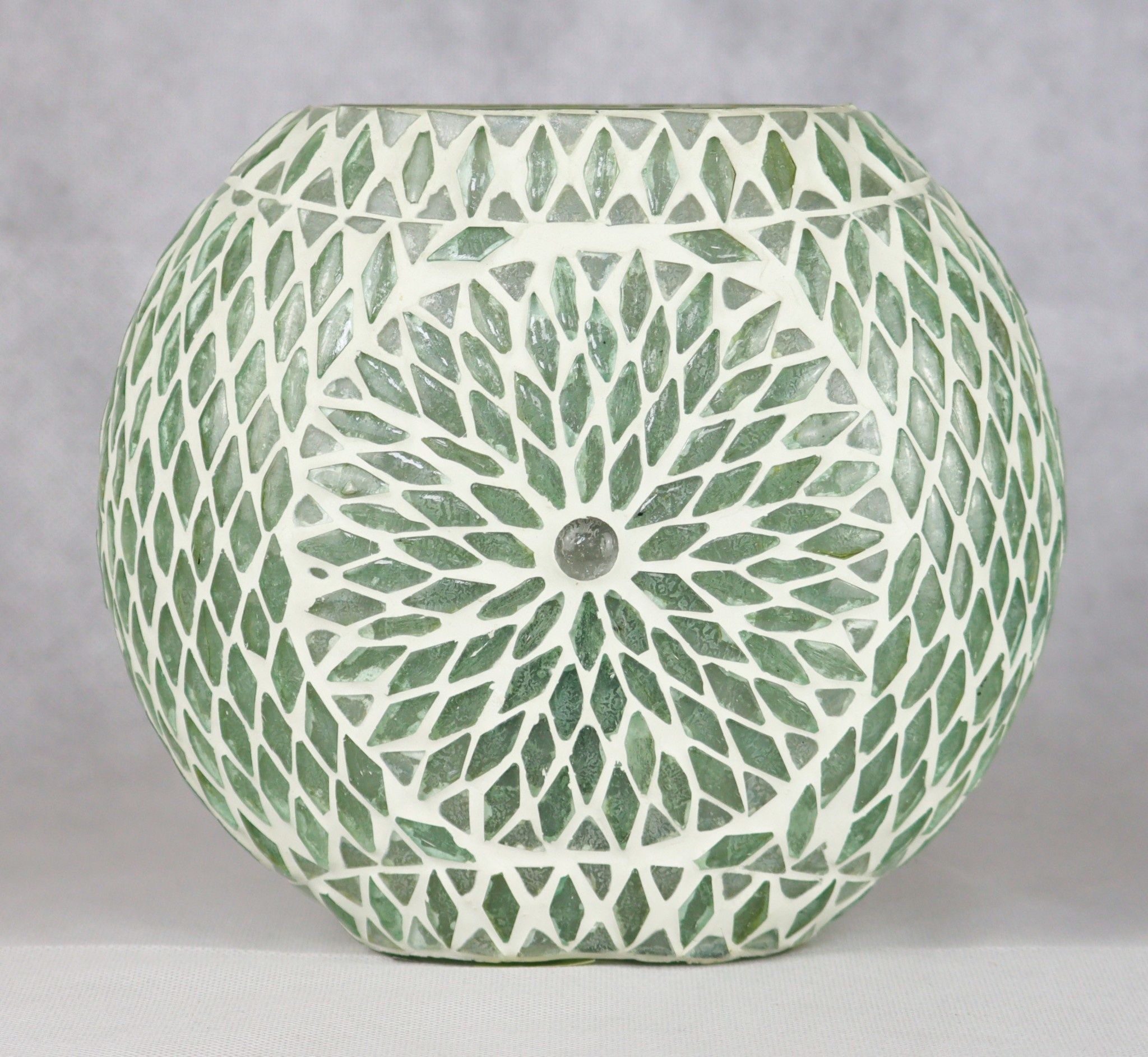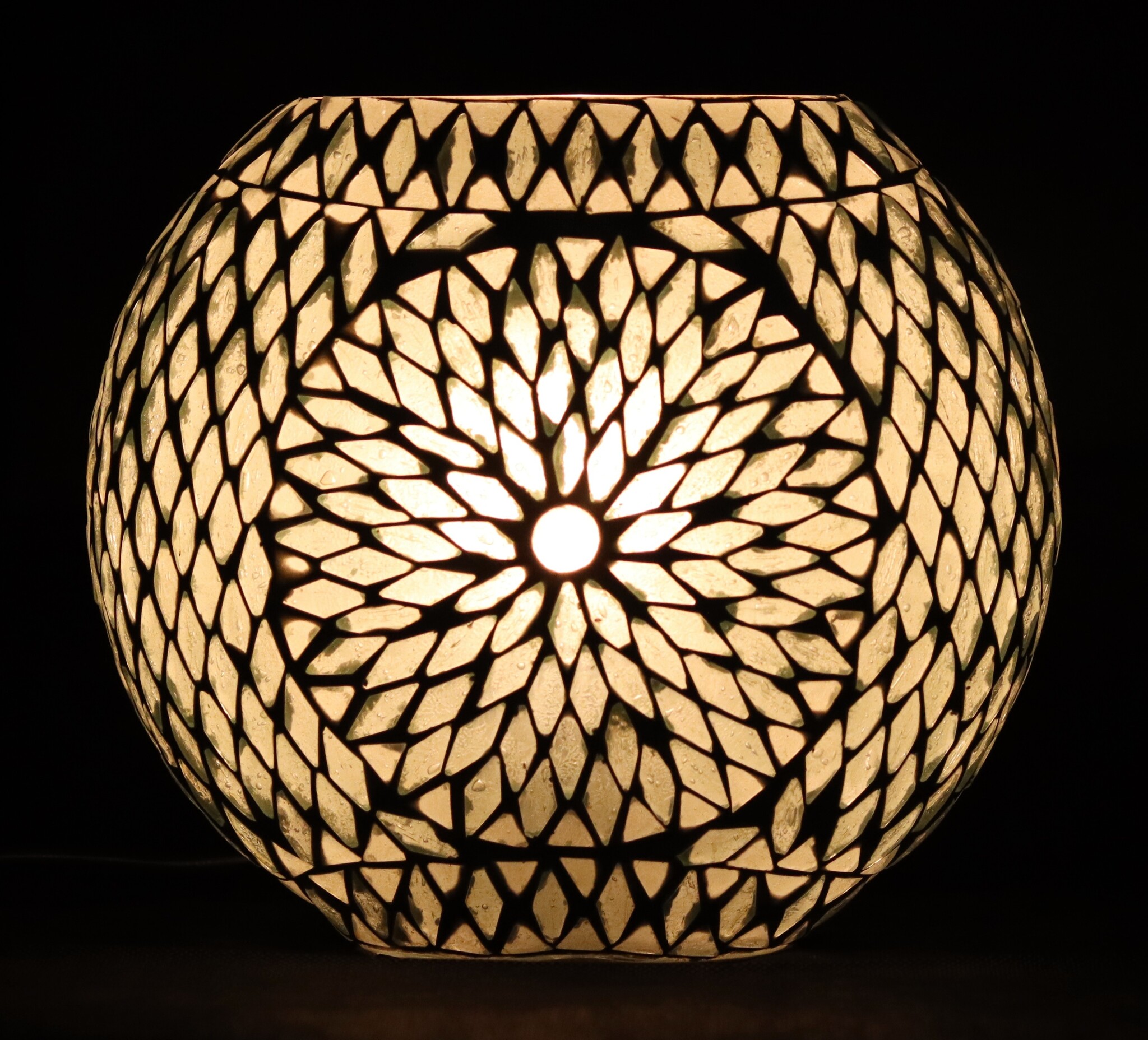 Glass mood lamp. Beautifully handmade mosaic lamp, in oval shape. Each white-milk white glass stone is manually applied to the underlying glass. In the dark, this table lamp gives a beautiful light effect as soon as the light shines through the mosaic. The oval shape ensures that this lamp can also stand on narrower surfaces such as windowsills, shelves, etc.